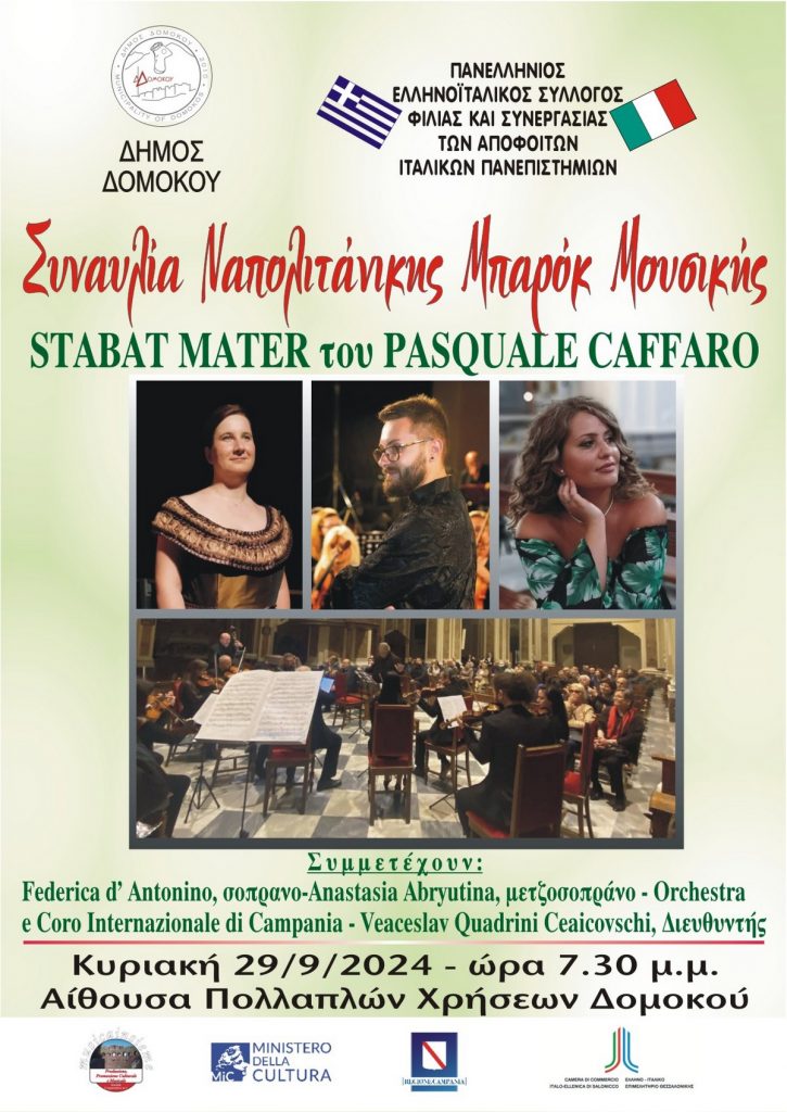 Ο Δήμος Δομοκού και ο Πανελλήνιος Ελληνοϊταλικός Σύλλογος Φιλίας και Συνεργασίας των Αποφοίτων Ιταλικών Πανεπιστημίων, στο πλαίσιο του 42ου Διεθνούς Φεστιβάλ Καρδίτσας, διοργανώνουν συναυλία Ναπολιτάνικης Μπαρόκ Μουσικής με το κορυφαίο έργο ¨Stabat Mater¨ του Pasquale Cafaro με την κορυφαία Ιταλική Ορχήστρα της Καμπανίας ¨Orchestra Internazionale di Campania¨, τη Μικτή Χορωδία Καρδίτσας του Ωδείου Καρδίτσας - Κωνσταντίνος Ευθυμιάδης και δύο εξαιρετικές σολίστ.