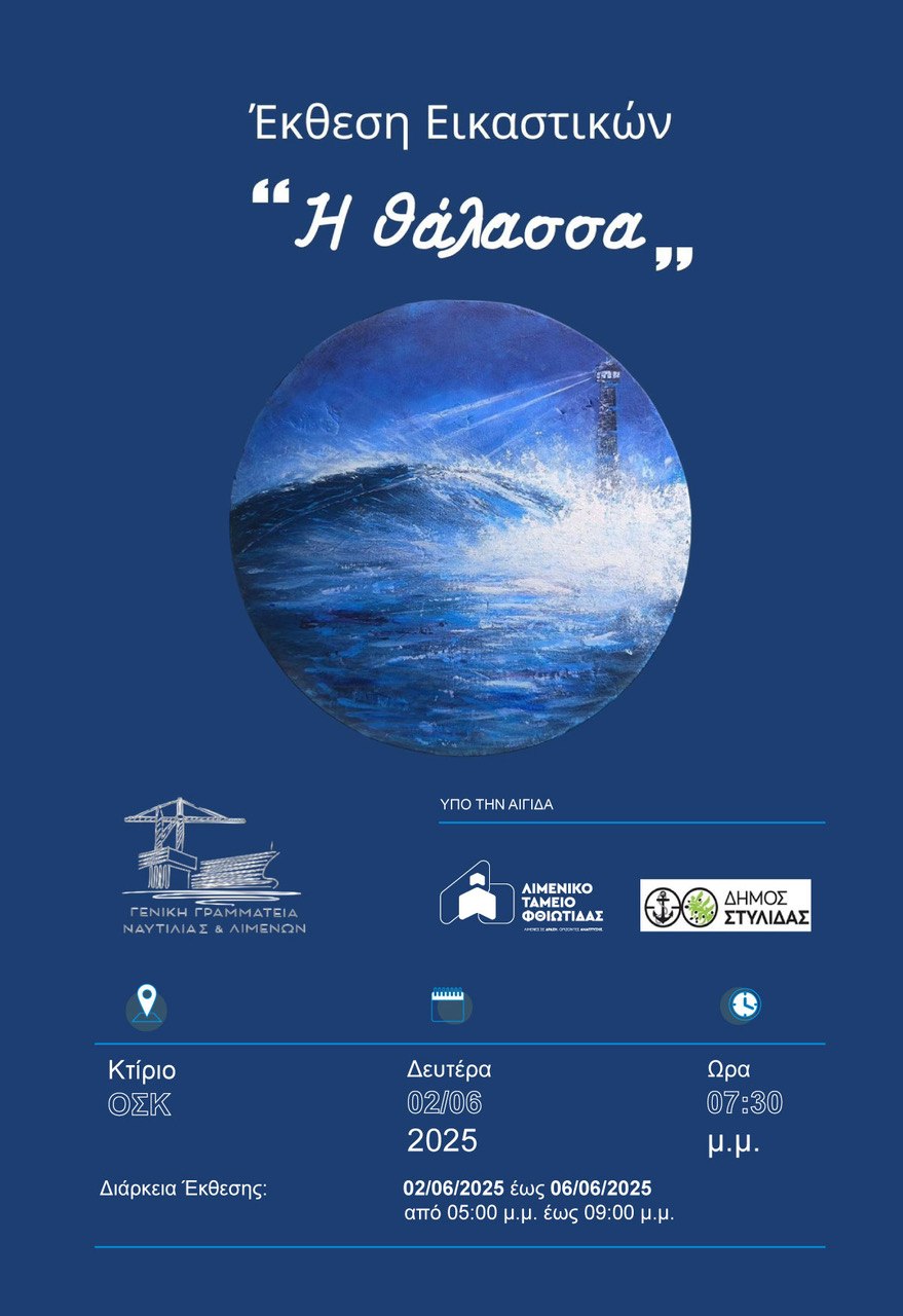 Σας προσκαλούμε στην έναρξη της περιοδεύουσας έκθεσης εικαστικών έργων "Η Θάλασσα", που διοργανώνει η Γενική Γραμματεία Ναυτιλίας και Λιμένων του Υπουργείου Ναυτιλίας και Νησιωτικής Πολιτικής, και φιλοξενείται από το Λιμενικό Ταμείο Φθιώτιδας.