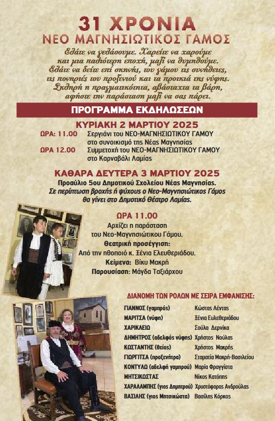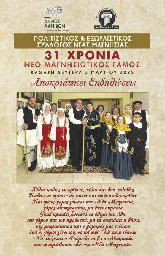 Ο Πολιτιστικός και Εξωραϊστικός Σύλλογος Νέας Μαγνησίας σας προσκαλεί την Καθαρά Δευτέρα 3 Μαρτίου 2025, στο παραδοσιακό έθιμο του Νέο Μαγνησιώτικου Γάμου, που φέτος συμπληρώνει 31 χρόνια!