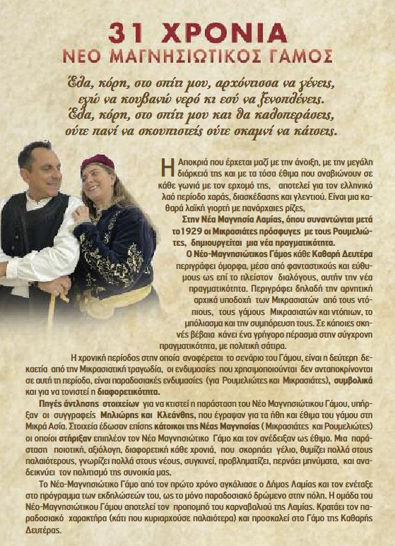 Για 31η χρονιά αναβιώνει το παραδοσιακό έθιμο του Νέου Μαγνησιώτικου Γάμου, που διοργανώνει κάθε Καθαρά Δευτέρα ο Πολιτιστικός & Εξωραϊστικός Σύλλογος Νέας Μαγνησίας, υπό την αιγίδα του Δήμου Λαμιέων.
