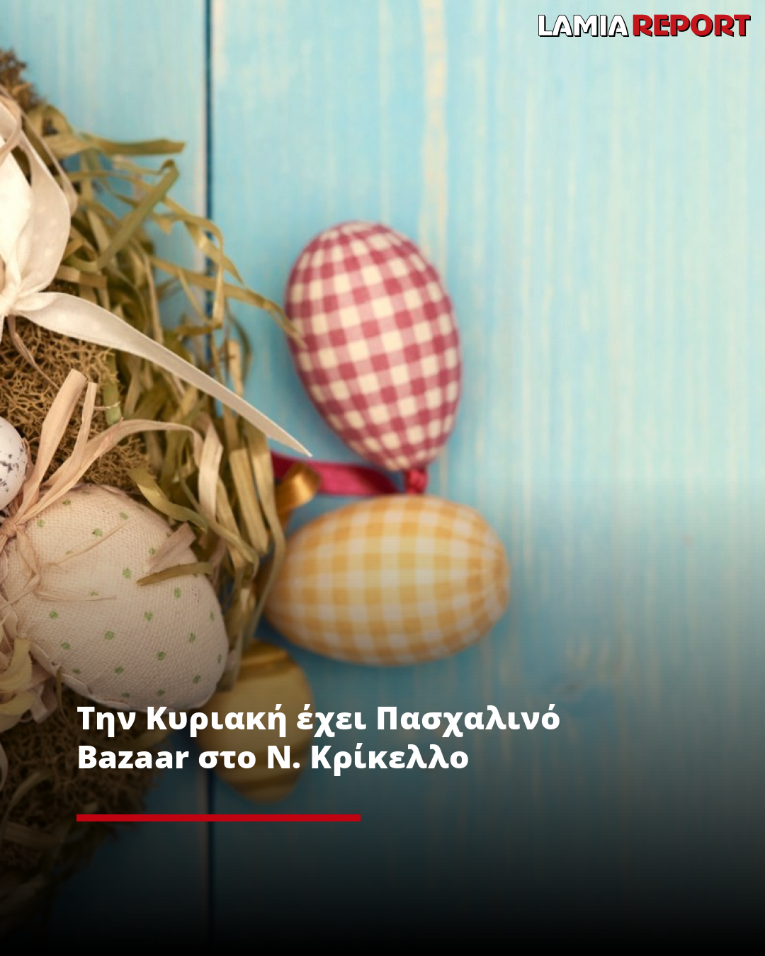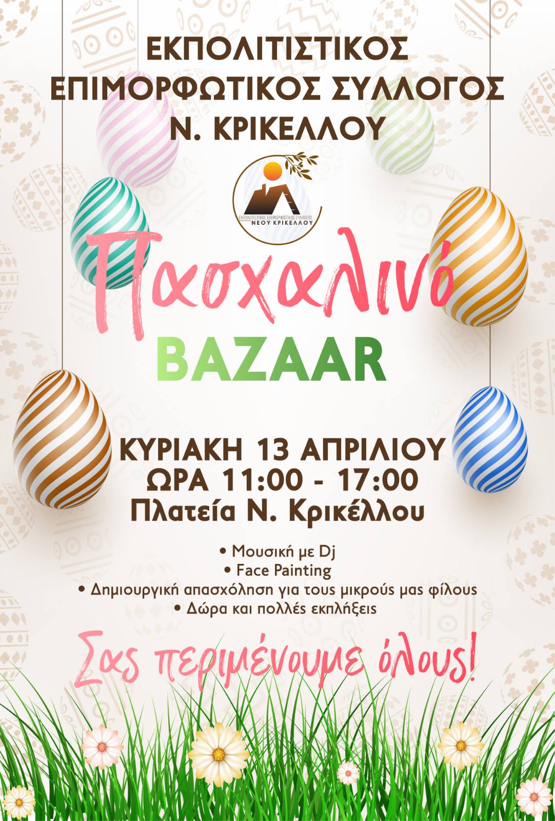 Ο Εκπολιτιστικός Επιμορφωτικός Σύλλογος Ν. Κρικέλλου, σας προσκαλεί στο Πασχαλινό Bazaar του, την Κυριακή 13 Απριλίου 2025 στην πλατεία του Ν. Κρικέλλου Λαμίας.