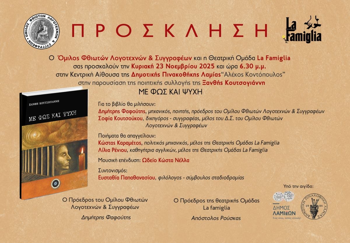 Την ποιητική συλλογή “ΜΕ ΦΩΣ ΚΑΙ ΨΥΧΗ” της Ξανθής Κουτσογιάννη παρουσιάζουν ο Όμιλος Φθιωτών Λογοτεχνών & Συγγραφέων και η Θεατρική Ομάδα La Famiglia, την Κυριακή 23 Νοεμβρίου 2025 και ώρα 6.30 μ.μ. στην Κεντρική Αίθουσα της Δημοτικής Πινακοθήκης Λαμίας “Αλέκος Κοντόπουλος”.