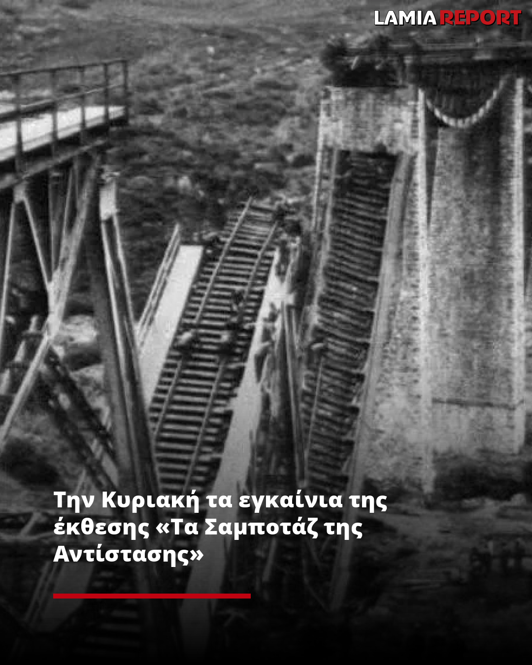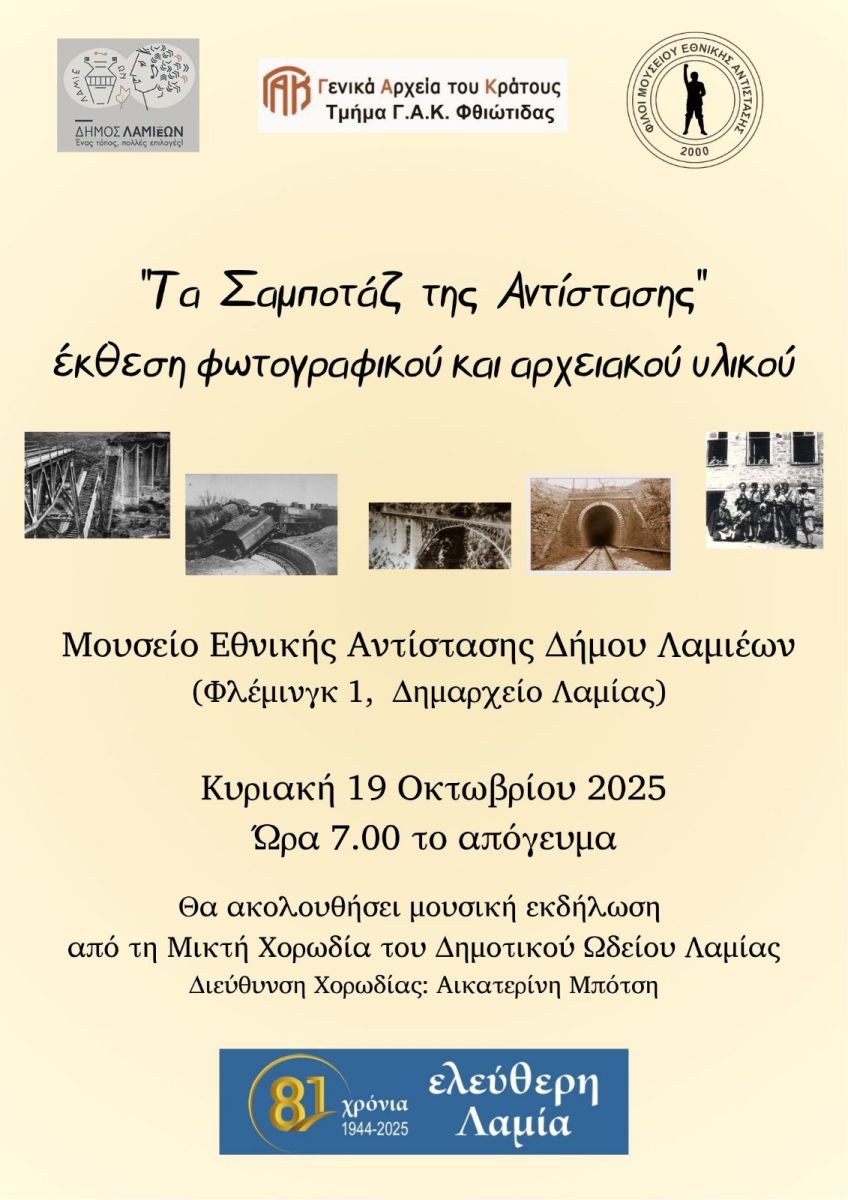 Ο Δήμος Λαμιέων, οι Φίλοι Μουσείου Εθνικής Αντίστασης και Σύγχρονης Ιστορίας Ρούμελης και τα Γενικά Αρχεία του Κράτους – Τμήμα ΓΑΚ Φθιώτιδας διοργανώνουν την έκθεση αρχειακού και φωτογραφικού υλικού με τίτλο «Τα Σαμποτάζ της Αντίστασης».
