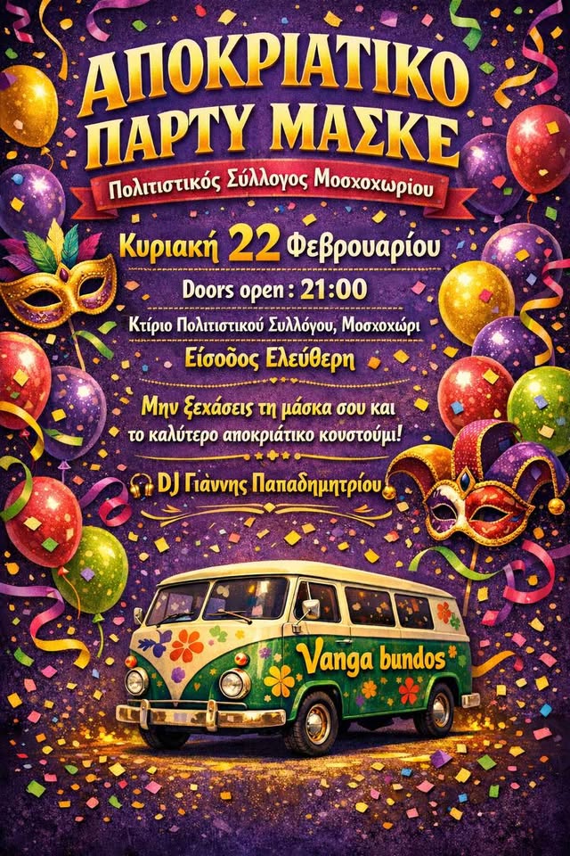 Σε ρυθμούς Αποκριάς ετοιμάζεται να χορέψει το Μοσχοχώρι, καθώς ο Πολιτιστικός Σύλλογος της περιοχής διοργανώνει ένα μεγάλο αποκριάτικο πάρτι μασκέ, την Κυριακή 22 Φεβρουαρίου, στο κτίριο του Συλλόγου.