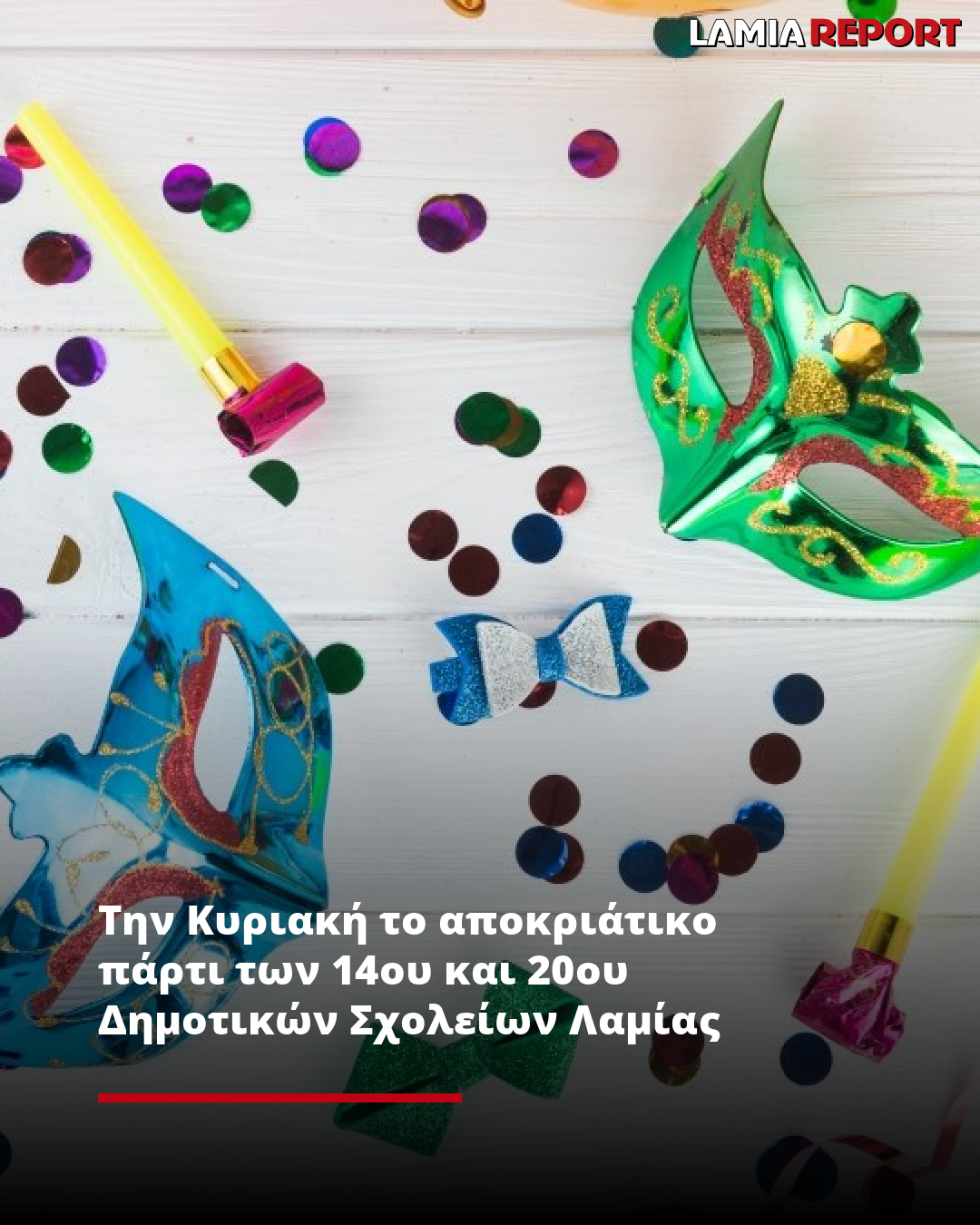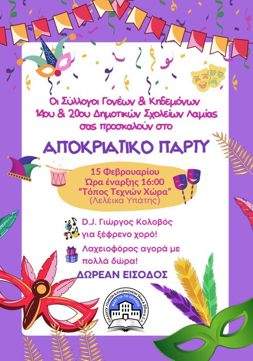 Οι σύλλογοι γονέων και κηδεμόνων των 14ου και 20ου Δημοτικών Σχολείων Λαμίας σας προσκαλούν σε ένα αποκριάτικο γλέντι!!!
