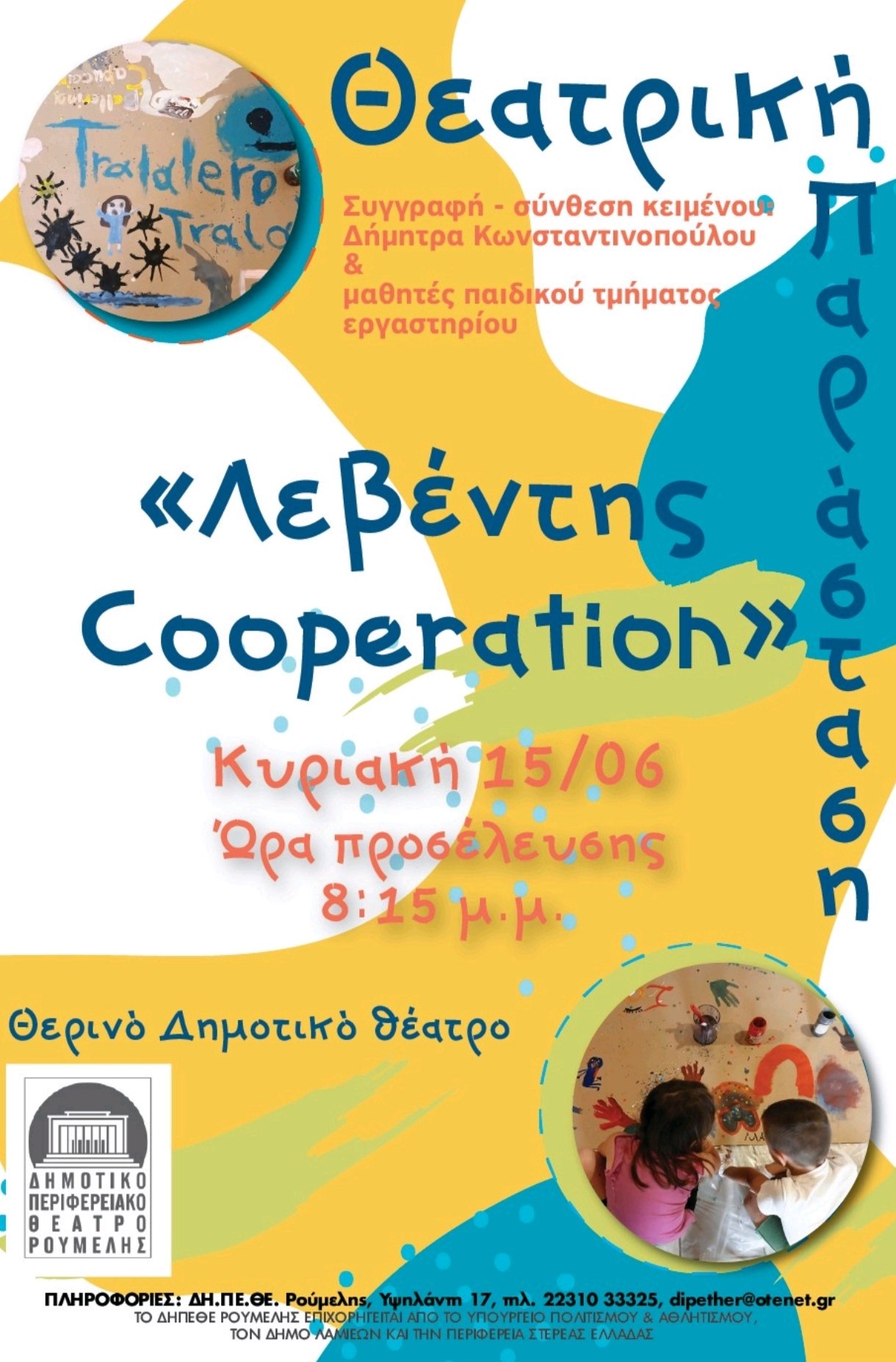 Το Θεατρικό Εργαστήρι για παιδιά, του ΔΗ.ΠΕ.ΘΕ. Ρούμελης, παρουσιάζει τη θεατρική παράσταση με τίτλο «Λεβέντης Cooperation», που αποτελεί την παρουσίαση της συλλογικής προσπάθειας του πρώτου τμήματος που λειτούργησε με μεγάλη επιτυχία κατά τη φετινή σχολική περίοδο.