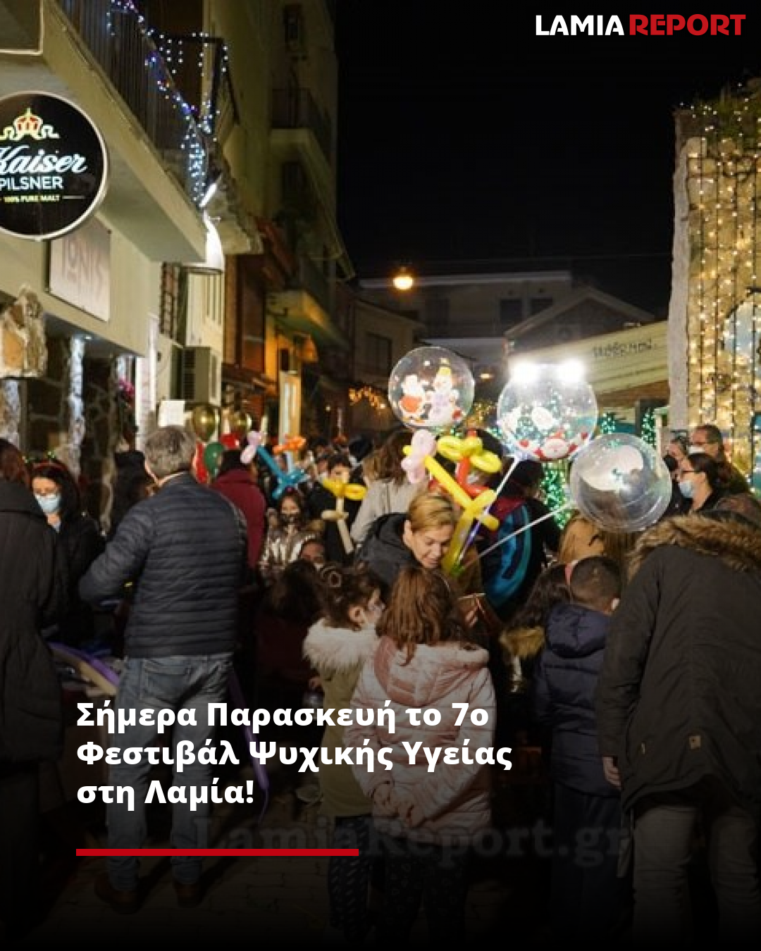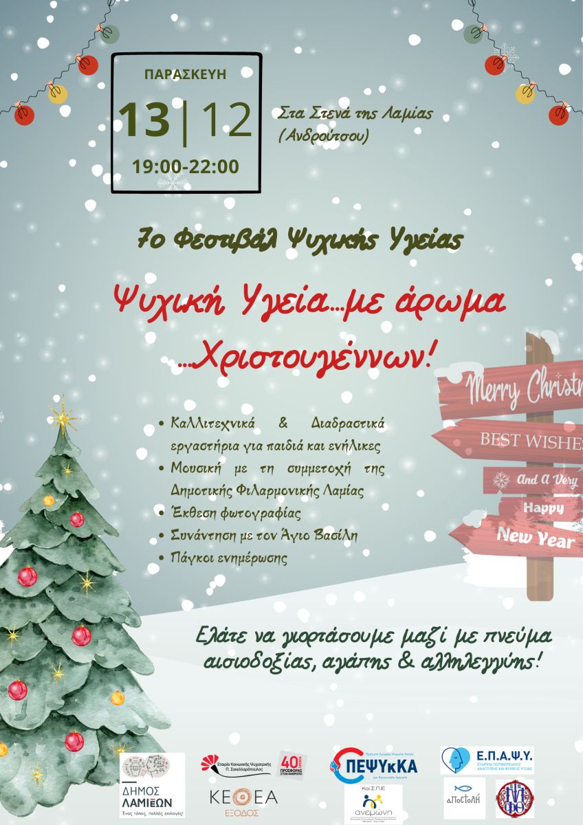 Τη διεξαγωγή του 7ου Φεστιβάλ Ψυχικής Υγείας με θέμα «Ψυχική υγεία… με άρωμα Χριστουγέννων» συνδιοργανώνουν ο Δήμος Λαμιέων με τους φορείς ΕΠΑΨΥ (Εταιρία Περιφερειακής Ανάπτυξης και Ψυχικής Υγείας), ΕΚΨ Π. Σακελλαρόπουλος (Εταιρία Κοινωνικής Ψυχιατρικής Π. Σακελλαρόπουλος), Κοι.Σ.Π.Ε. «ΑΝΕΜΩΝΗ» (Κοινωνικός Συνεταιρισμός Περιορισμένης Ευθύνης «ΑΝΕΜΩΝΗ»), ΠΕΨΥκΚΑ (Πρότυπη Εταιρία Ψυχικής Υγείας και Κοινωνικής Αρωγής), ΑΠΟΣΤΟΛΗ και ΚΕΘΕΑ ΕΞΟΔΟΣ (Κέντρο Θεραπείας Εξαρτημένων Ατόμων), με σκοπό να δημιουργήσουν ζεστή χριστουγεννιάτικη ατμόσφαιρα με συμπερίληψη και ενσυναίσθηση.