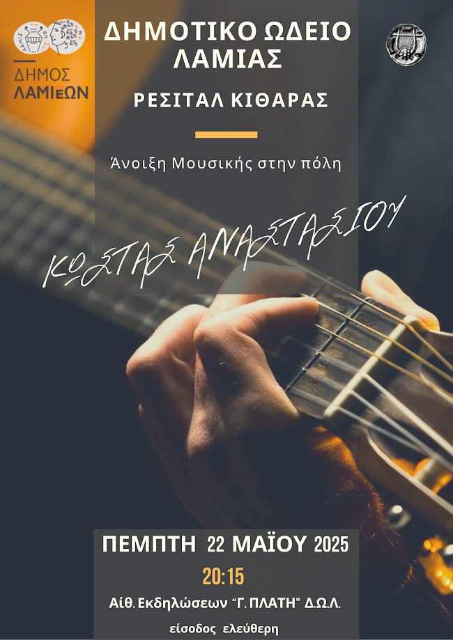 Το Δημοτικό Ωδείο Λαμίας, στο πλαίσιο του θεσμού «Άνοιξη Μουσικής στην πόλη», διοργανώνει Ρεσιτάλ Κιθάρας του Κώστα Αναστασίου, την Πέμπτη 22 Μαΐου 2025 και ώρα 20.15, στην Αίθουσα Εκδηλώσεων «Γεωργίου Πλατή» του Ωδείου, που βρίσκεται στη διασταύρωση Αχιλλέως και Δυοβουνιώτη.
