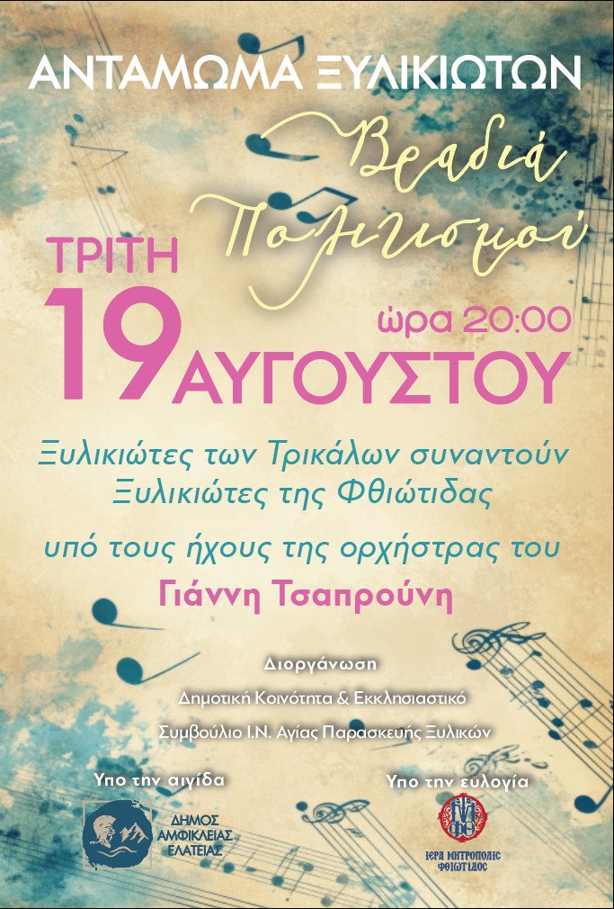 Μία βραδιά πολιτισμού η οποία διοργανώνεται από τη Δημοτική Κοινότητα και το Εκκλησιαστικό Συμβούλιο του Ιερού Ναού Αγίας Παρασκευής Ξυλικών και τελεί υπό την αιγίδα του Δήμου Αμφίκλειας - Ελάτειας και την ευλογία της Ιεράς Μητροπόλεως Φθιώτιδας.