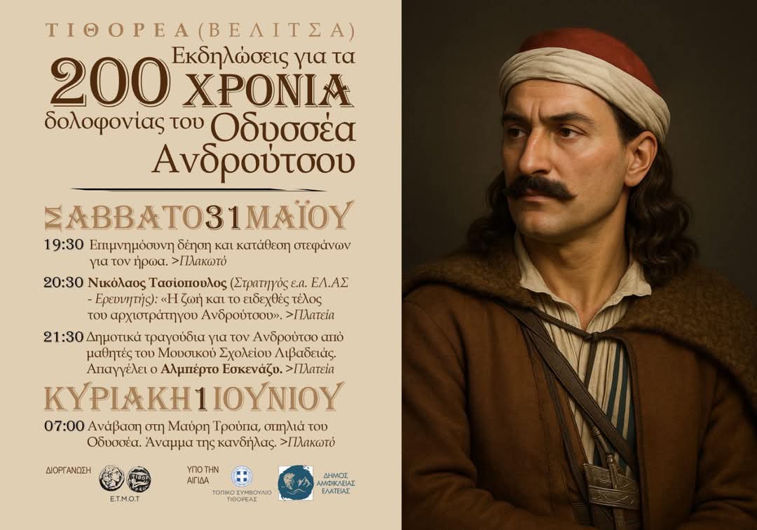 Ο Δήμος Αμφίκλειας - Ελάτειας και η Κοινότητα Τιθορέας σας προσκαλούν στις εκδηλώσεις που θα γίνουν με αφορμή τη συμπλήρωση 200 χρόνων από τη δολοφονία του Οδυσσέα Ανδρούτσου.