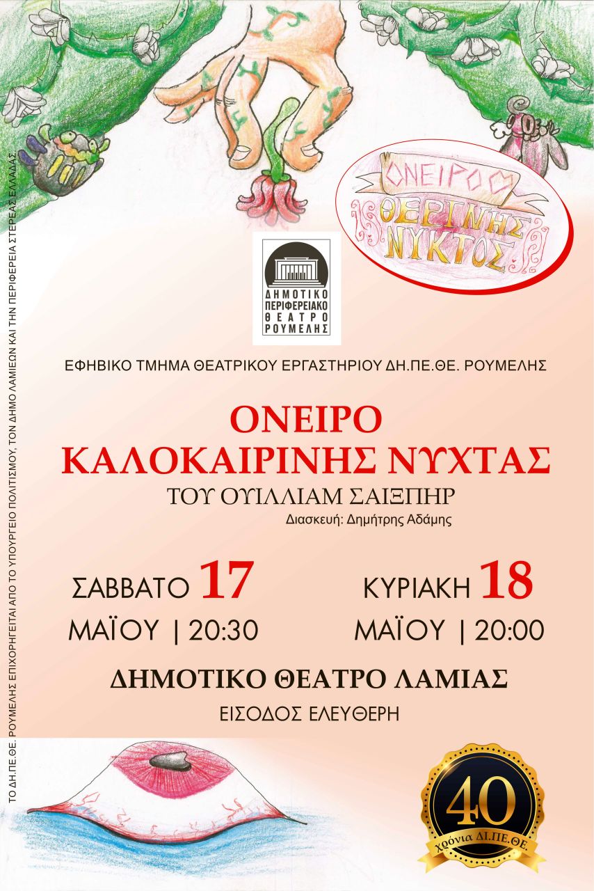 Το Εφηβικό Τμήμα του Θεατρικού Εργαστηρίου του ΔΗ.ΠΕ.ΘΕ. Ρούμελης παρουσιάζει την παράσταση «Όνειρο Καλοκαιρινής Νύχτας» του Ουίλλιαμ Σαίξπηρ, σε διασκευή του Δημήτρη Αδάμη, το Σάββατο 17 και την Κυριακή 18 Μαΐου, στο Δημοτικό Θέατρο Λαμίας.