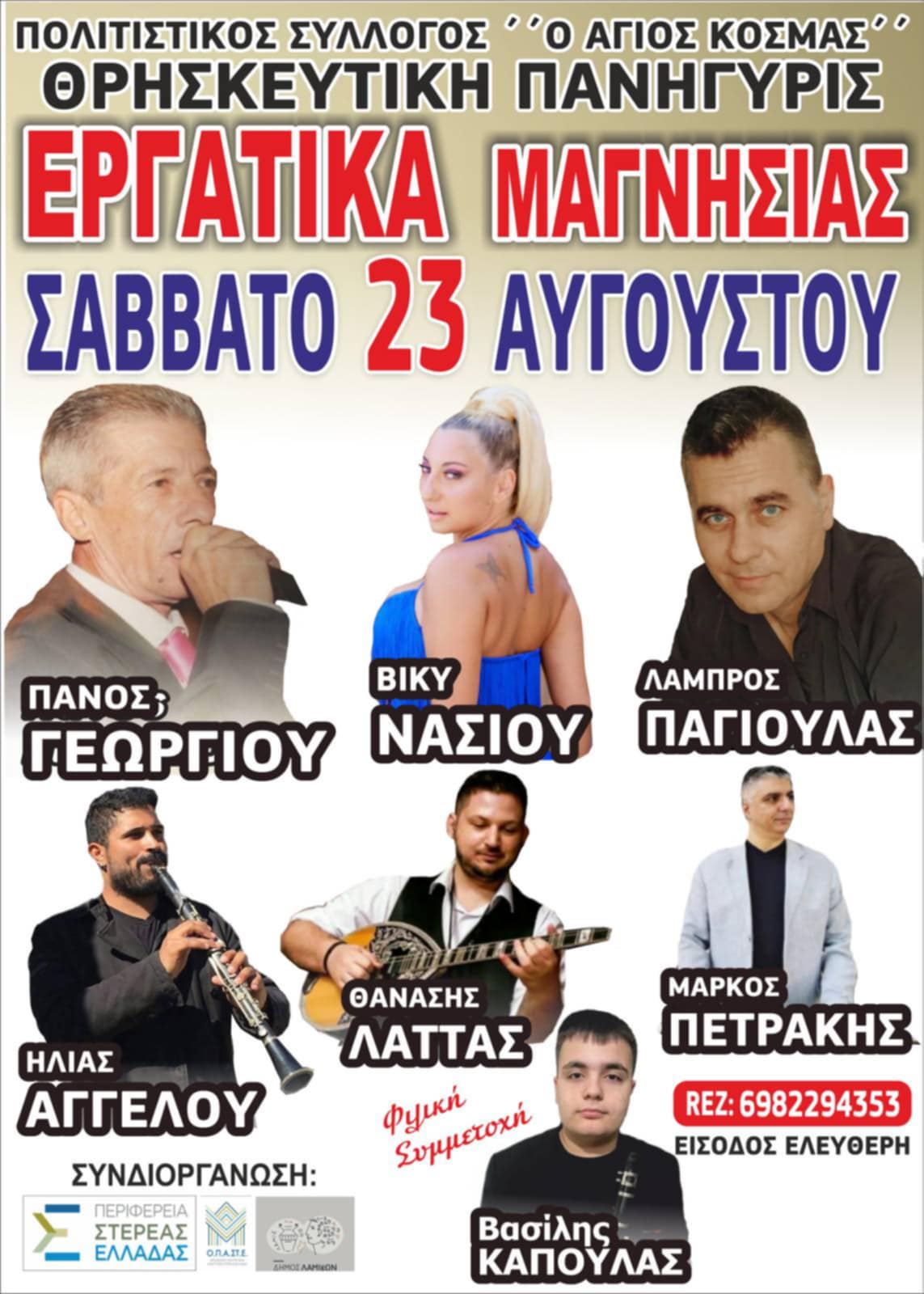Στο κλαρίνο θα είναι ο Ηλίας Αγγέλου, μαζί με τη φιλική συμμετοχή του Βασίλη Καπούλα, που αναμένεται να ανεβάσουν τη θερμοκρασία με τους παραδοσιακούς ήχους.