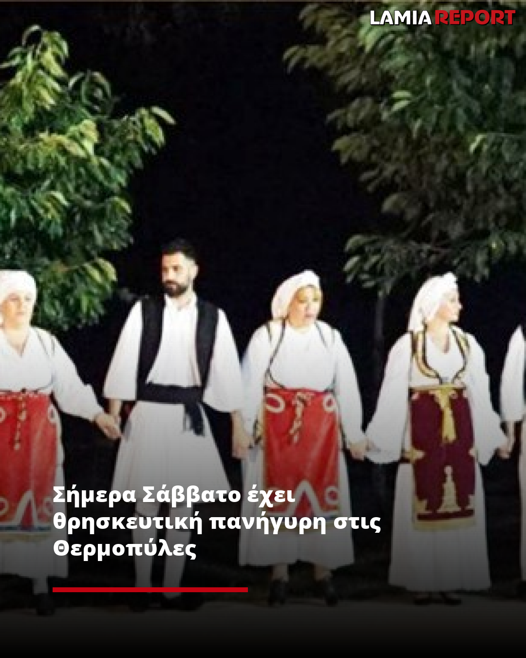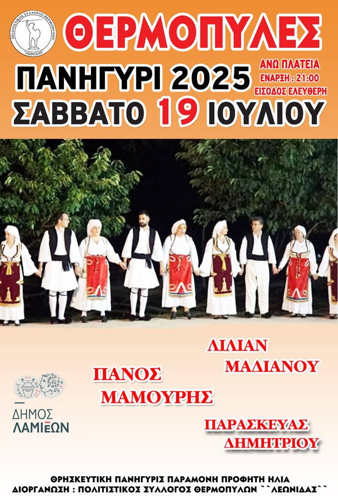 Ο Δήμος Λαμιέων και ο Πολιτιστικός Σύλλογος Θερμοπυλών «Λεωνίδας», συνδιοργανώνουν θρησκευτική πανήγυρη την παραμονή της εορτής του Προφήτη Ηλία, το Σάββατο 19 Ιουλίου 2025 στις 21:00, στην Άνω Πλατεία Θερμοπυλών.