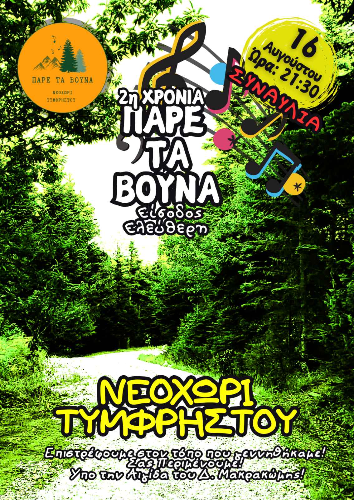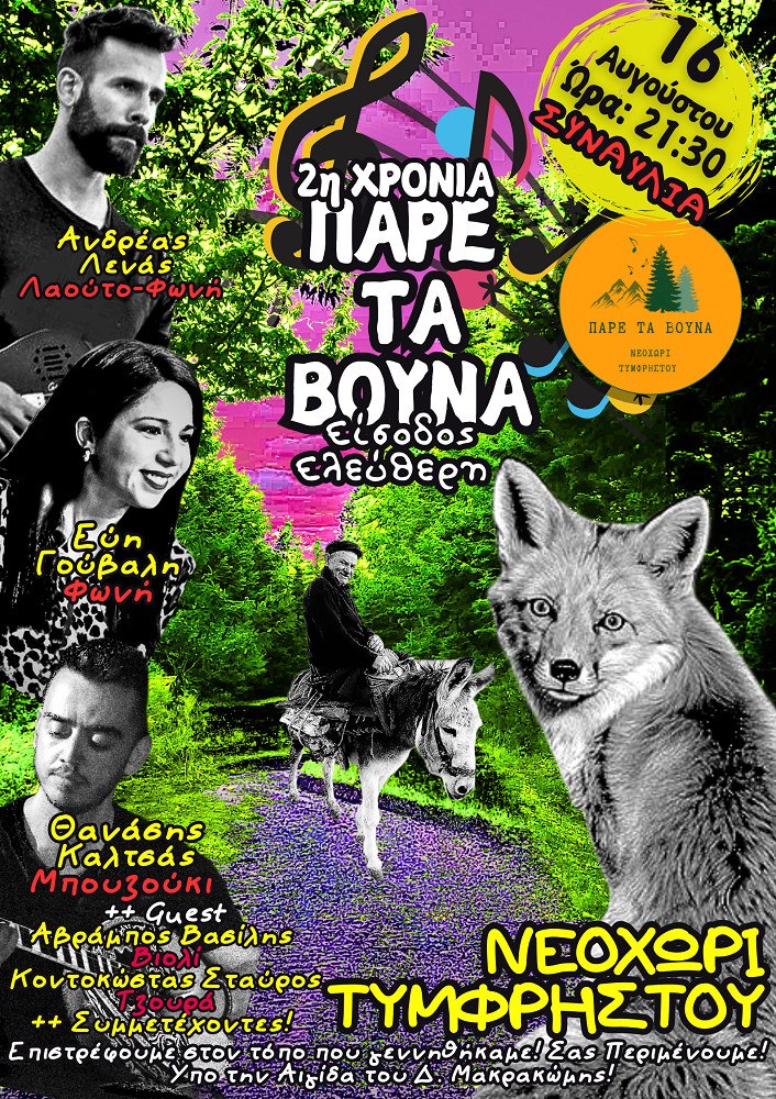 Το Σάββατο 16 Αυγούστου, στις 21:30, πραγματοποιείται για δεύτερη χρονιά το "Πάρε Τα Βουνά", μια ιδιαίτερη συναυλία στο Νεοχώρι Τυμφρηστού.