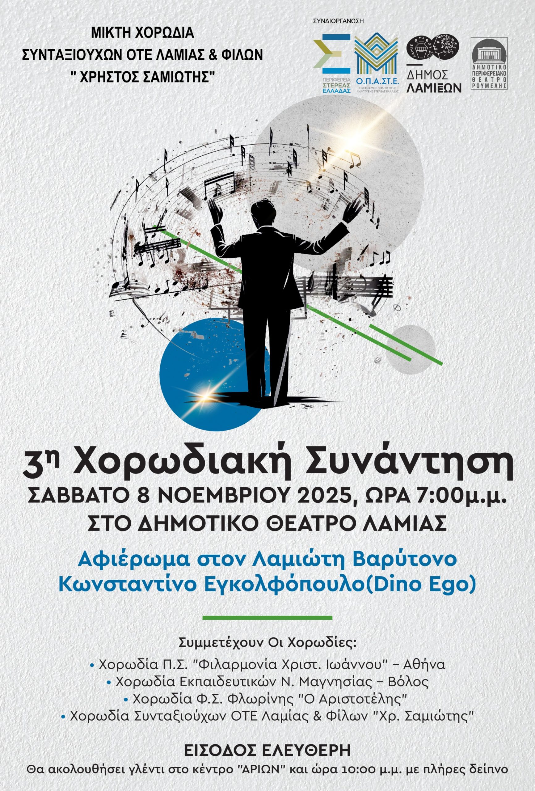 Η Μικτή Χορωδία Συνταξιούχων ΟΤΕ Λαμίας & φίλων "Χρήστος Σαμιώτης" σας προσκαλεί στην 3η Χορωδιακή Συνάντηση που θα πραγματοποιηθεί το Σάββατο 8 Νοεμβρίου, στις 7:00 μ.μ., στο Δημοτικό Θέατρο Λαμίας.