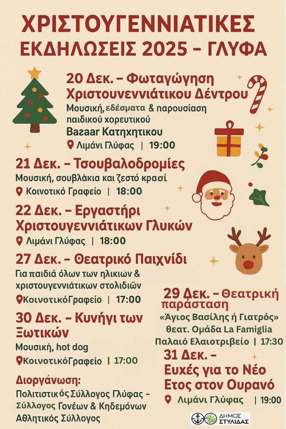 Ο Πολιτιστικός Σύλλογος Γλύφας σας προσκαλεί στο άναμμα του Χριστουγεννιάτικου Δέντρου το Σάββατο στις 20 Δεκεμβρίου στις 19:30 στο λιμάνι της Γλύφας.