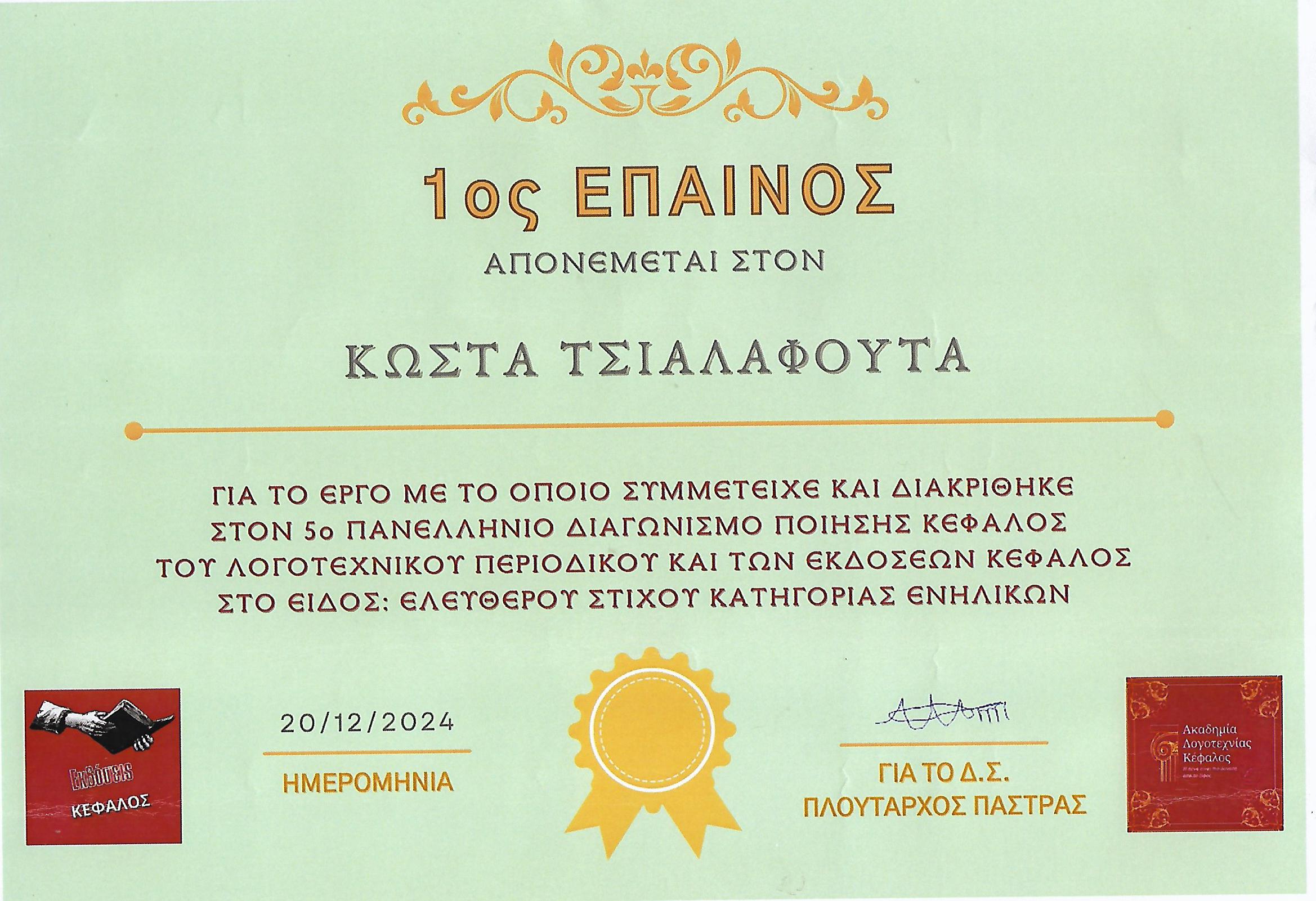 Ο Κώστας Τσιαλαφούτας, εκπαιδευτικός και πρώην πρόεδρος του Ομίλου Φθιωτών Λογοτεχνών και Συγγραφέων, έλαβε τον 1ο ΕΠΑΙΝΟ στον 5ο Πανελλήνιο Διαγωνισμό Ποίησης Κέφαλος, στην κατηγορία Ελεύθερου Στίχου Ενηλίκων.