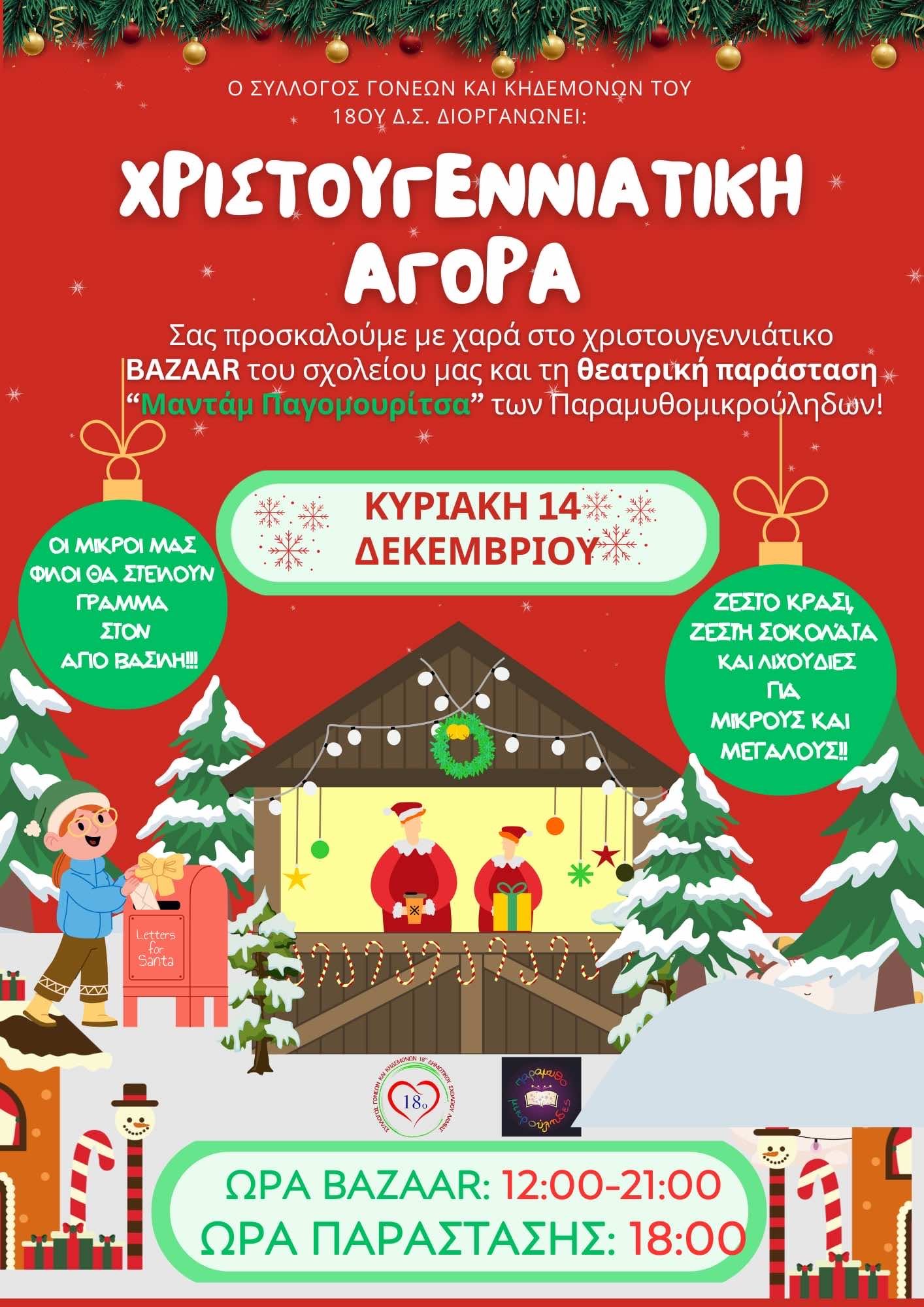 Ο Σύλλογος Γονέων & Κηδεμόνων του σχολείου μας, με μεγάλη χαρά διοργανώνει για 4η συνεχή χρονιά Χριστουγεννιάτικη Αγορά στο χώρο του σχολείου!