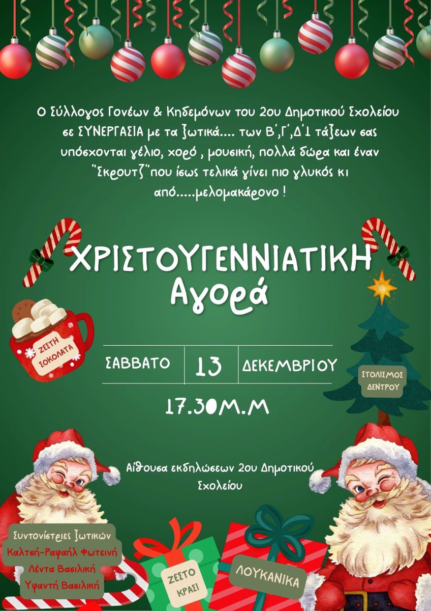 Ο Σύλλογος Γονέων & Κηδεμόνων του 2ου Δημοτικού Σχολείου Λαμίας, σε συνεργασία με τα χαριτωμένα ξωτικά των Β',Γ',Δ'1 τάξεων και με συντονίστριες τις εκπαιδευτικούς Λέντα Βασιλική, Καλτσή-Ραφαήλ Φωτεινή και Υφαντή Βασιλική αντίστοιχα, παρουσιάζουν μια παιχνιδιάρικη, γιορτινή διασκευή της κλασικής ιστορίας του Καρόλου Ντίκενς, "Ο Σκρούτζ"!