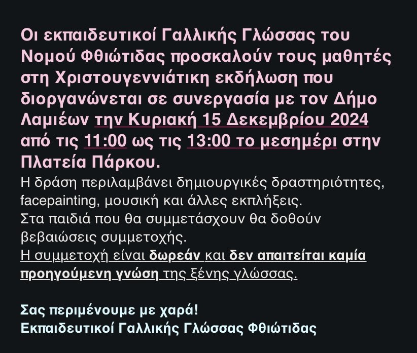 Ο Σύλλογος Καθηγητών Γαλλικής Γλώσσας Νομού Φθιώτιδας σε συνεργασία με τον Δήμο Λαμιέων διοργανώνει την Κυριακή (15/12/2024), στις 11:00, στην Πλατεία Πάρκου χριστουγεννιάτικη δράση με πολλές εκπλήξεις για τους μικρούς γαλλομαθείς φίλους και όχι μόνο.