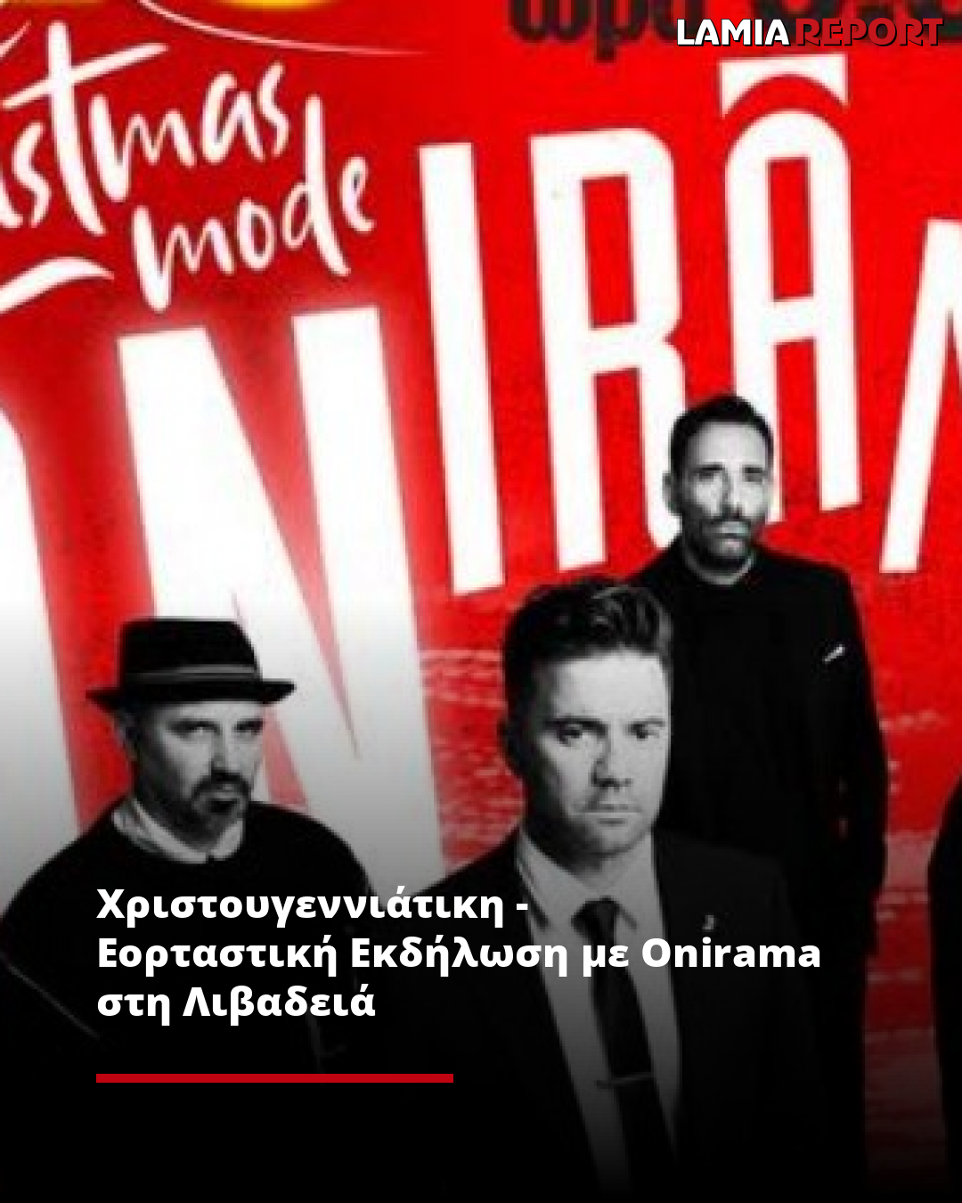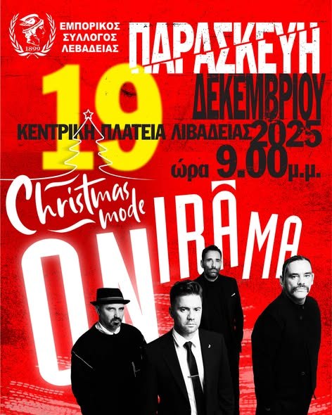 Την Παρασκευή 19 Δεκεμβρίου, στις 9 το βράδυ, η κεντρική πλατεία της Λιβαδειάς γεμίζει μουσική, φως και γιορτινή ενέργεια με τους ONIRAMA να ανεβάζουν τον παλμό της πόλης και να απογειώνουν το εορταστικό κλίμα.