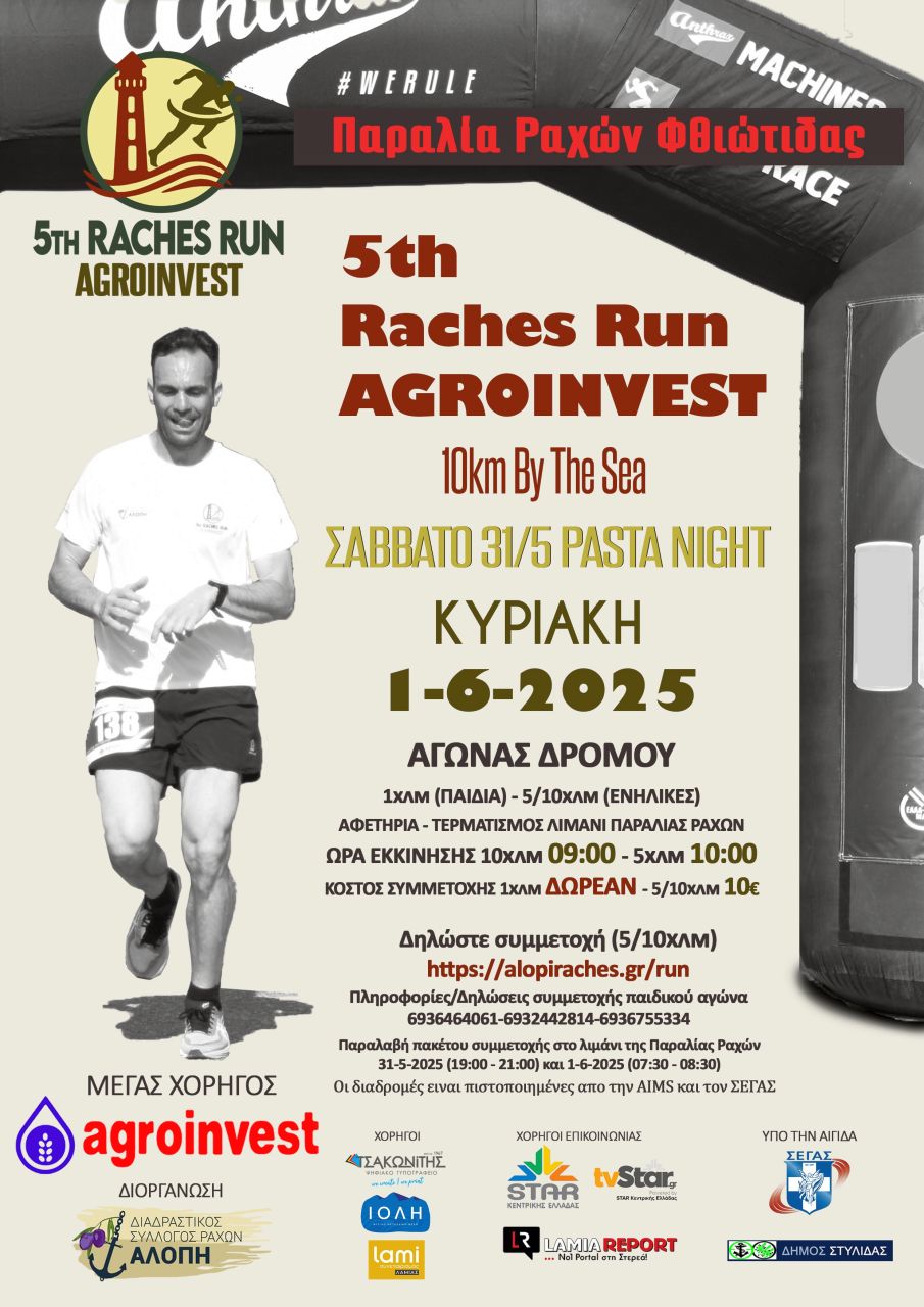 Ο Διαδραστικός Σύλλογος Ραχών ΑΛΟΠΗ, υπό την αιγίδα του Δήμου Στυλίδας και του ΣΕΓΑΣ, διοργανώνει για 5η συνεχόμενη χρονιά το “Raches Run– Agroinvest” την Κυριακή 1 Ιουνίου 2025 στην παραλία Ραχών, προσκαλώντας μικρούς και μεγάλους να συμμετάσχουν σε μια μοναδική εμπειρία άθλησης και διασκέδασης!