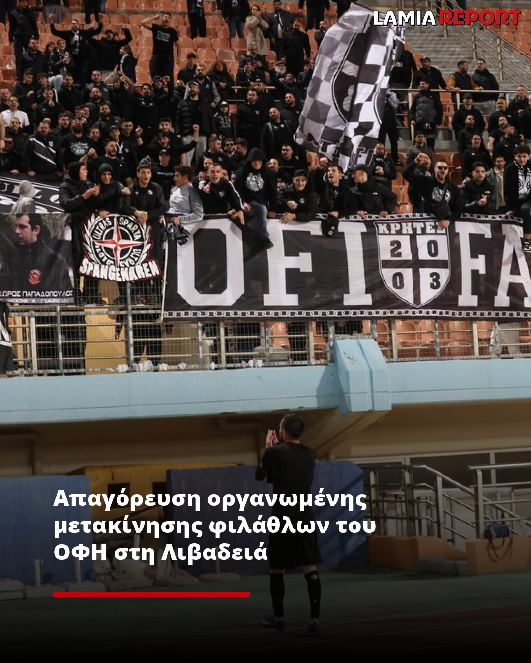 Η ΓΕΠΑΔ Στερεάς Ελλάδας, ανακοίνωσε ότι, σύμφωνα με Απόφαση που εκδόθηκε από το Υπουργείο Παιδείας, Θρησκευμάτων και Αθλητισμού, απαγορεύεται η οργανωμένη μετακίνηση των φιλάθλων της φιλοξενούμενης ομάδας του ΟΦΗ, κατά τη διεξαγωγή του ποδοσφαιρικού αγώνα για τη 2η αγωνιστική του Κυπέλλου Ελλάδας αγωνιστικής περιόδου 2025-2026, με το Λεβαδειακό, που είναι προγραμματισμένος να διεξαχθεί την Τετάρτη 11/02/2026 και ώρα 17:00, στο Δημοτικό Στάδιο Λιβαδειάς «ΛΑΜΠΡΟΣ ΚΑΤΣΩΝΗΣ».
