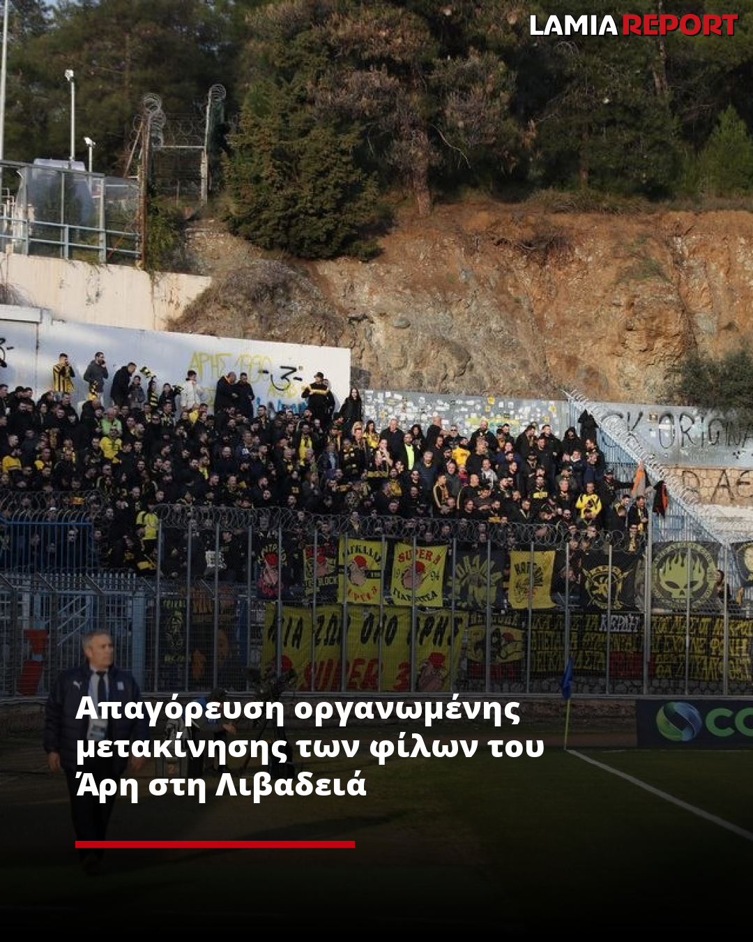 Από τη Γενική Περιφερειακή Αστυνομική Διεύθυνση Στερεάς Ελλάδας ανακοινώνεται ότι, σύμφωνα με Απόφαση που εκδόθηκε από το Υπουργείο Παιδείας, Θρησκευμάτων και Αθλητισμού, απαγορεύεται η οργανωμένη μετακίνηση των φιλάθλων της φιλοξενούμενης ομάδας Π.Α.Ε. ΑΡΗΣ, για τον ποδοσφαιρικό αγώνα της 23ης αγωνιστικής του πρωταθλήματος SUPER LEAGUE 1, μεταξύ των ομάδων ΛΕΒΑΔΕΙΑΚΟΣ - ΑΡΗΣ, ο οποίος θα διεξαχθεί την Κυριακή 16-02-2025 και ώρα 15:00, στο Δημοτικό Στάδιο Λιβαδειάς, για σοβαρούς λόγους διαφύλαξης της δημόσιας τάξης και ασφάλειας.