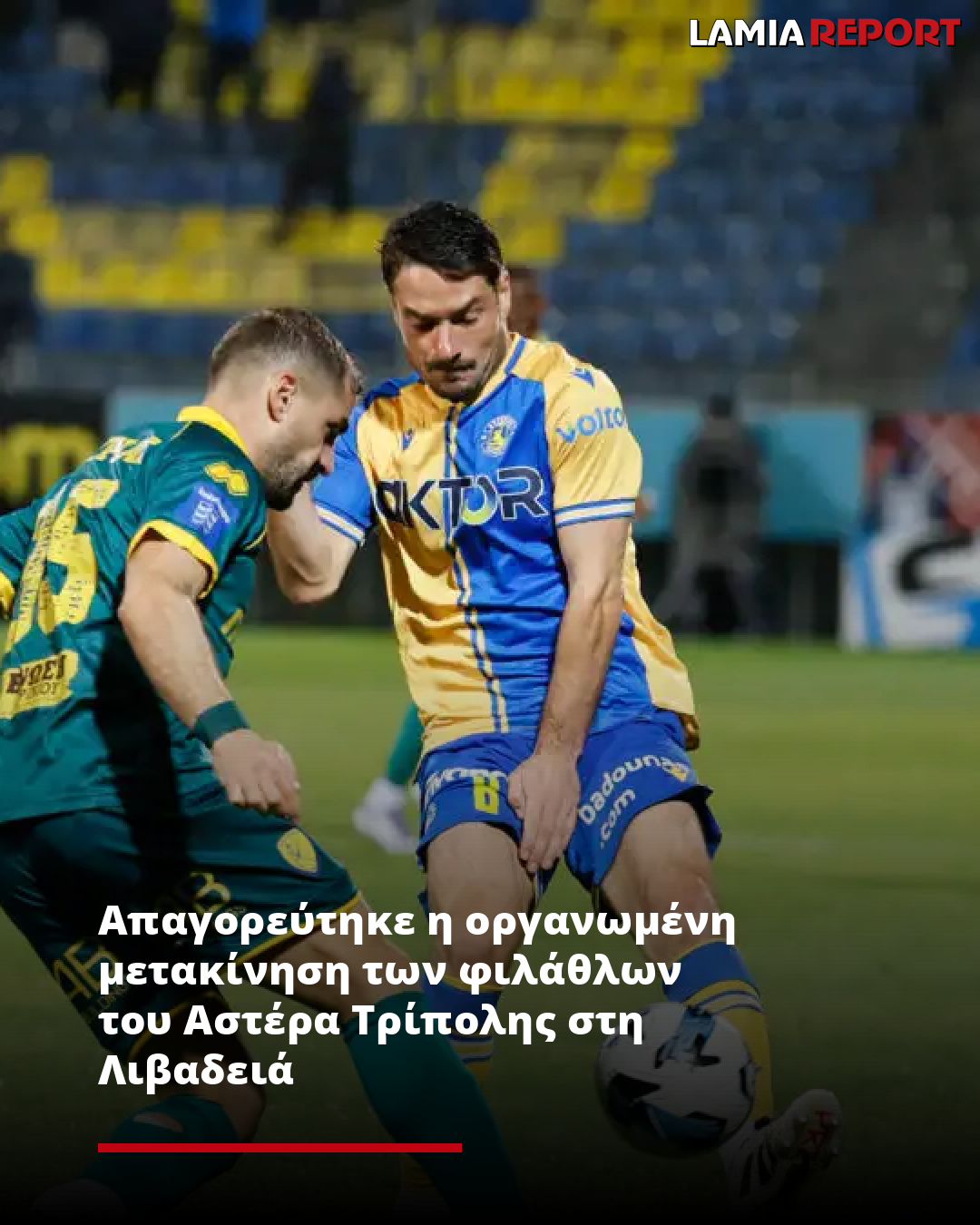 Από τη Γενική Περιφερειακή Αστυνομική Διεύθυνση Στερεάς Ελλάδας ανακοινώνεται ότι, σύμφωνα με Απόφαση που εκδόθηκε από το Υπουργείο Παιδείας, Θρησκευμάτων και Αθλητισμού, απαγορεύεται η οργανωμένη μετακίνηση των φιλάθλων του Αστέρα Τρίπολης για το αγώνα της ομάδας τους στο πλαίσιο της 19ης αγωνιστικής της SUPER LEAGUE 1, με αντίπαλο τον Λεβαδειακό στη Λιβαδειά.