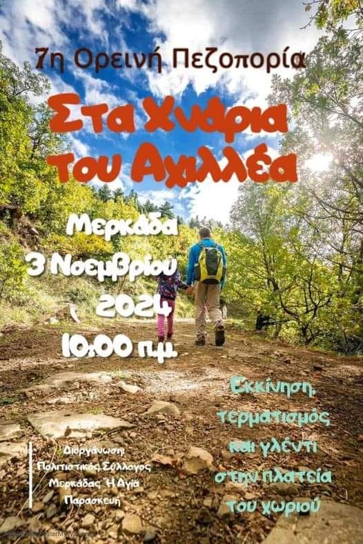 Την 7η ορεινή πεζοπορία "Στα χνάρια του Αχιλλέα", διοργανώνει ο Πολιτιστικός Σύλλογος Μερκάδας "Η Αγία Παρασκευή".