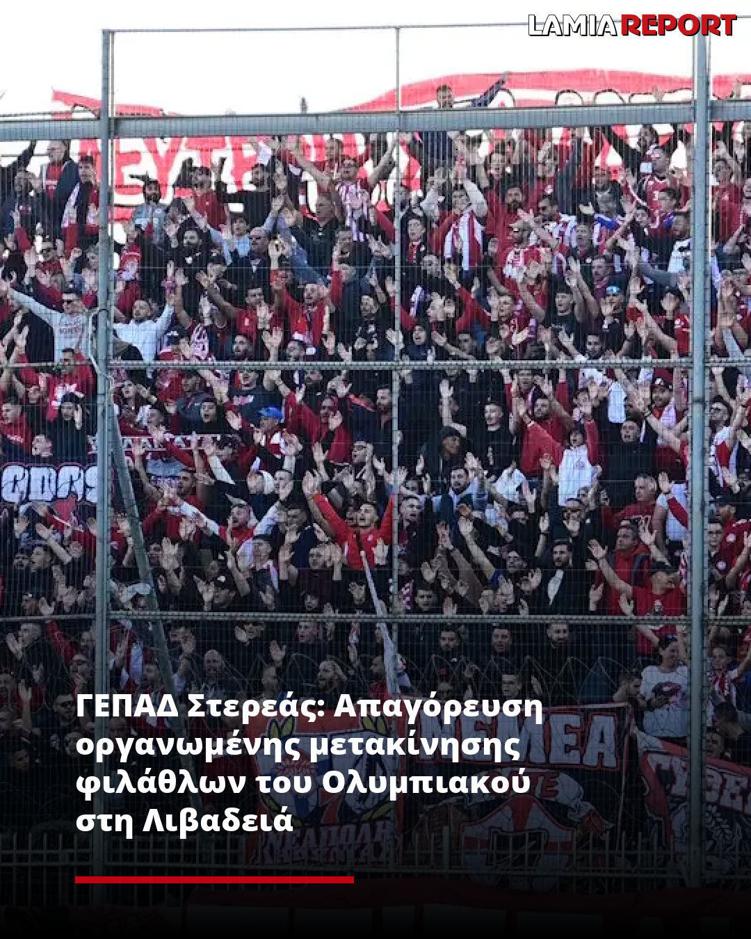 Η ΓΕΠΑΔ Στερεάς Ελλάδας, ανακοίνωσε ότι, σύμφωνα με απόφαση που εκδόθηκε από το Υπουργείο Παιδείας, Θρησκευμάτων και Αθλητισμού, απαγορεύεται η οργανωμένη μετακίνηση των φιλάθλων του Ολυμπιακού, κατά τη διεξαγωγή του ποδοσφαιρικού αγώνα της 21ης αγωνιστικής του πρωταθλήματος SUPER LEAGUE 1, αγωνιστικής περιόδου 2025-2026, με το Λεβαδειακό που είναι προγραμματισμένος να διεξαχθεί αύριο Σάββατο 14-02-2026 και ώρα 19:30, στο Δημοτικό Στάδιο Λιβαδειάς «ΛΑΜΠΡΟΣ ΚΑΤΣΩΝΗΣ».