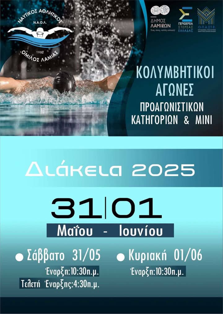 Ο Δήμος Λαμιέων σε συνεργασία με το Ναυτικό Όμιλο Λαμίας, την Περιφέρεια Στερεάς Ελλάδας και υπό την αιγίδα της Κολυμβητικής Ομοσπονδίας Ελλάδας, διοργανώνει για τρίτη συνεχόμενη χρονιά τους κολυμβητικούς αγώνες «Διάκεια 2025».