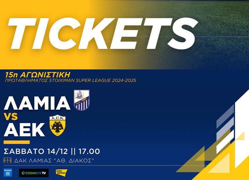 *Τονίζεται ότι το Σάββατο 14/12, μέρα της αναμέτρησης με την ΑΕΚ, δεν θα υπάρχουν εκδοτήρια στο ΔΑΚ Λαμίας “Αθ. Διάκος”.