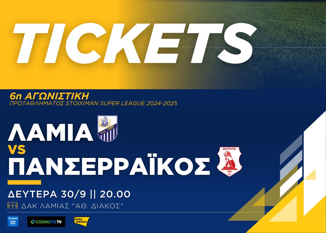 Η διάθεση των εισιτηρίων γίνεται ηλεκτρονικά 24 ώρες το 24ωρο από το site της ομάδας μας tickets.lamia1964.gr μέχρι και την έναρξη του αγώνα και από τα γραφεία της ομάδας (Πλ. Ελευθερίας 3, 1ος όροφος), Τρίτη 24/09 και Τετάρτη 25/09 από 10:00 μέχρι 13:00, Πέμπτη 26/09 και Παρασκευή 27/09 από 10:00 μέχρι 13:00 και από 18:00 μέχρι 20:00 και Δευτέρα 30/09 από 10:00 μέχρι 13:00.