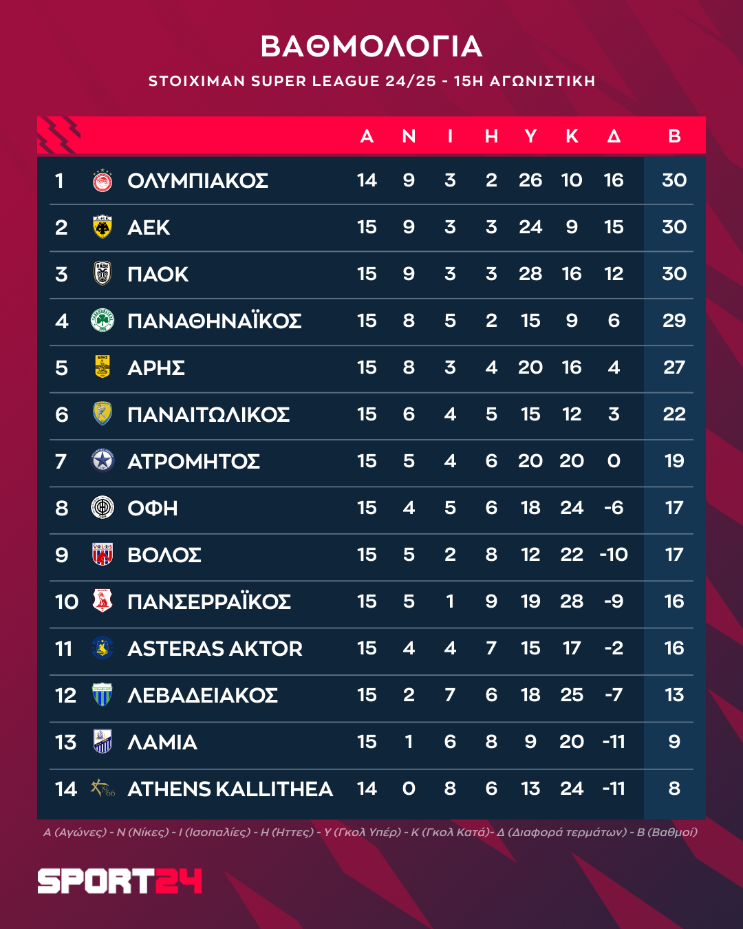 Αυτό σημαίνει ότι, πλέον και μετά από 15 αγωνιστικές στη Stoiximan Super League, έχουμε τριπλή ισοβαθμία στην κορυφή με Ολυμπιακό, ΠΑΟΚ και ΑΕΚ, ο Παναθηναϊκός καραδοκεί στο -1 και ο Άρης ακολουθεί στο -2. Όλοι, δηλαδή, για την ώρα είναι… σχεδόν μαζί! Φυσικά, η αγωνιστική κλείνει τη Δευτέρα (16/12), με τον Ολυμπιακό να φιλοξενείται από την Athens Kallithea στη Λεωφόρο, οπότε οι «ερυθρόλευκοι» έχουν την ευκαιρία, αν επιβεβαιώσουν τον χαρακτήρα του φαβορί στο «Απ. Νικολαΐδης», να αποσπαστούν από τους άλλους τέσσερις εκ νέου.