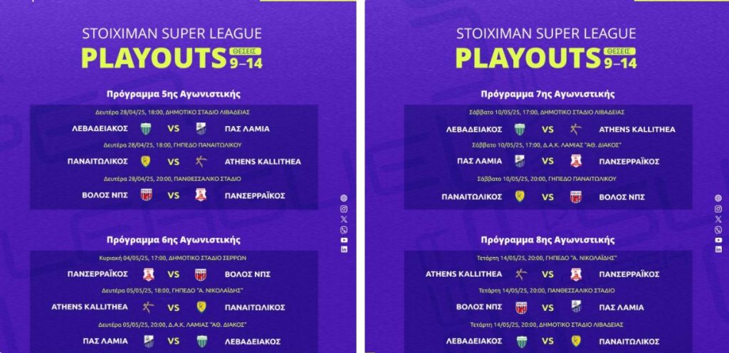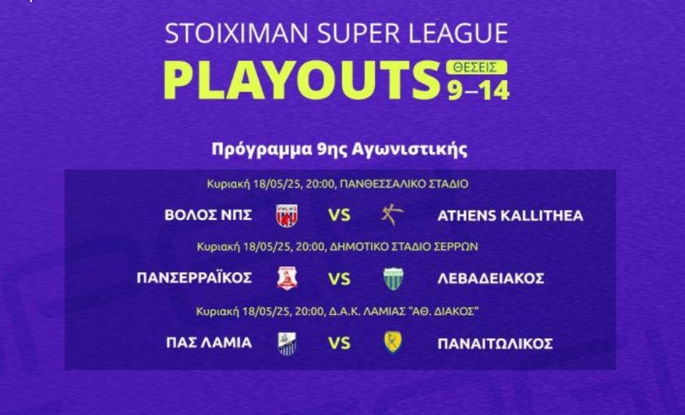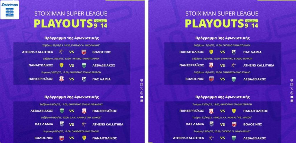 Από την Super League ανακοινώθηκε το αναλυτικό πρόγραμμα με τις ημερομηνίες και τις ώρες διεξαγωγής των αγώνων play out για τις θέσεις 9 έως 14, που θα κρίνει ποιες δύο ομάδες δε θα συνεχίσουν στη μεγάλη κατηγορία.