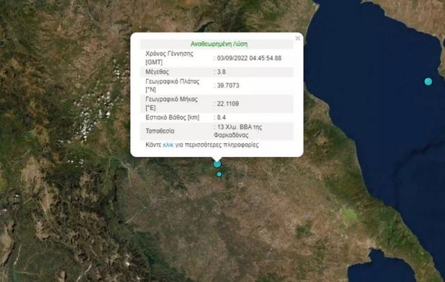 Σύμφωνα με το Γεωδυναμικό Ινστιτούτο Αθηνών ο σεισμός που έγινε αισθητός και στη Λάρισα, σημειώθηκε στην περιοχή του Τυρνάβου και ήταν 3,8 Ρίχτερ.