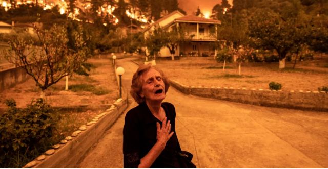 «Η Κριτσιόπη Παναγιώτα, 81 ετών, αντιδρά καθώς μια πυρκαγιά πλησιάζει στο σπίτι της. Εν μέσω του θερμότερου και πιο μακροχρόνιου καύσωνα των τελευταίων 30 ετών, με θερμοκρασίες που αγγίζουν τους 47°C, εκατοντάδες δασικές πυρκαγιές ξέσπασαν σε όλη τη χώρα, πλήττοντας σοβαρά το δεύτερο μεγαλύτερο νησί της Ελλάδας. Χιλιάδες κάτοικοι και τουρίστες απομακρύνθηκαν με βάρκες», λέει η περιγραφή της φωτογραφίας.