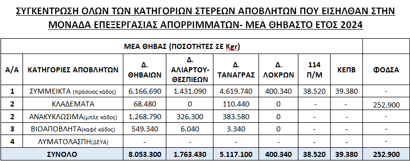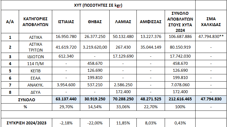 ΣΥΓΚΕΝΤΡΩΣΗ ΟΛΩΝ ΤΩΝ ΚΑΤΗΓΟΡΙΩΝ ΣΤΕΡΕΩΝ ΑΠΟΒΛΗΤΩΝ ΠΟΥ ΕΝΑΠΟΤΕΘΗΚΑΝ ΣΤΟΥΣ 4 ΧΥΤΑ ΓΙΑ ΤΟ ΕΤΟΣ 2024