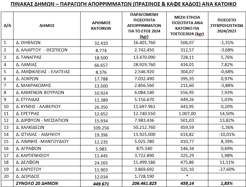 Η συνολική παραγωγήαστικών στερεών αποβλήτων των 20 Δήμωνπου εισήλθε στους χώρους αρμοδιότητας του Φο.Δ.Σ.Α Στερεάς Ελλάδας Α.Ε ανήλθε για το έτος 2024 σε 209.251.035 kgr. Η παραγωγή απορριμμάτων Σύμμεικτα [(πράσινος κάδος) και Βιοαπόβλητα (καφέ κάδος)] ανά Δήμο και κάτοικο έχει όπως παρακάτω: