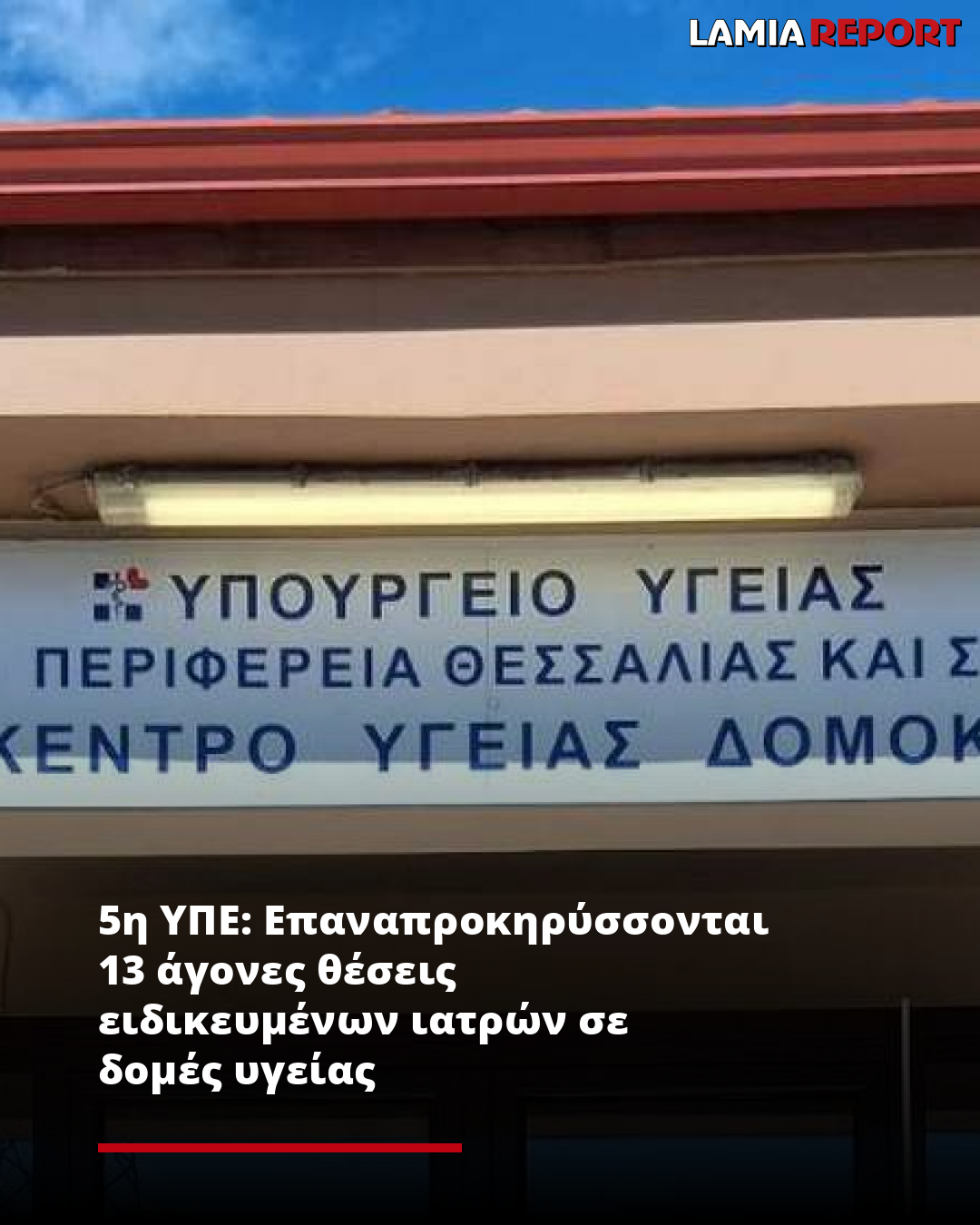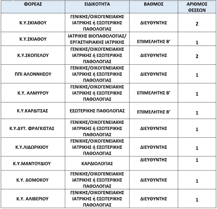 Στο πλαίσιο της συνεχούς ενίσχυσης των δομών παροχής πρωτοβάθμιας φροντίδας υγείας, ο Διοικητής της 5ης Υ.Πε. Θεσσαλίας και Στερεάς Ελλάδας Φώτης Σερέτης, ανακοίνωσε την προκήρυξη δεκατριών (13) θέσεων ειδικευμένων ιατρών του κλάδου Ε.Σ.Υ., που είχαν καταστεί άγονες με την από 11.11.2025 προκήρυξη, για δομές υγείας, αρμοδιότητας της 5ης Υ.Πε.,