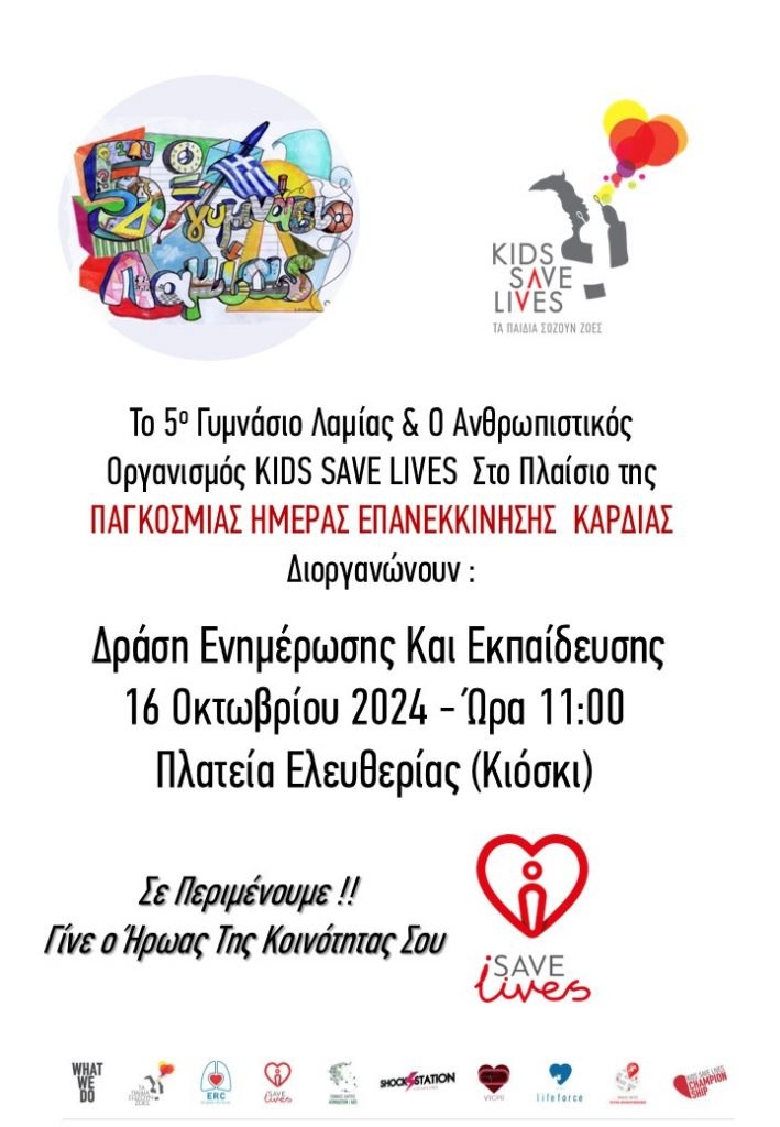 «Το 5ο Γυμνάσιο Λαμίας, με αφορμή την Παγκόσμια Ημέρα Επανεκκίνησης Καρδιάς, διοργανώνει δράση ενημέρωσης και εκπαίδευσης την Τετάρτη, 16 Οκτωβρίου 2024, στις 11:00, στο κιόσκι της Πλατείας Ελευθερίας.