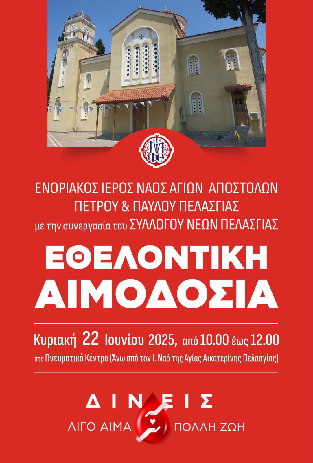 Στην προσπάθεια μας αυτή καλούμε όλους τους αιμοδότες, αλλά και όσους για πρώτη φορά θέλουν να βοηθήσουν στην προσπάθεια αυτή της τοπικής μας Εκκλησίας, να προσέλθουν την Κυριακή 22 Ιουνίου 2025 στον Ιερό Ναό Αγίων Αποστόλων Πέτρου και Παύλου Πελασγίας και να προσφέρουν αίμα.