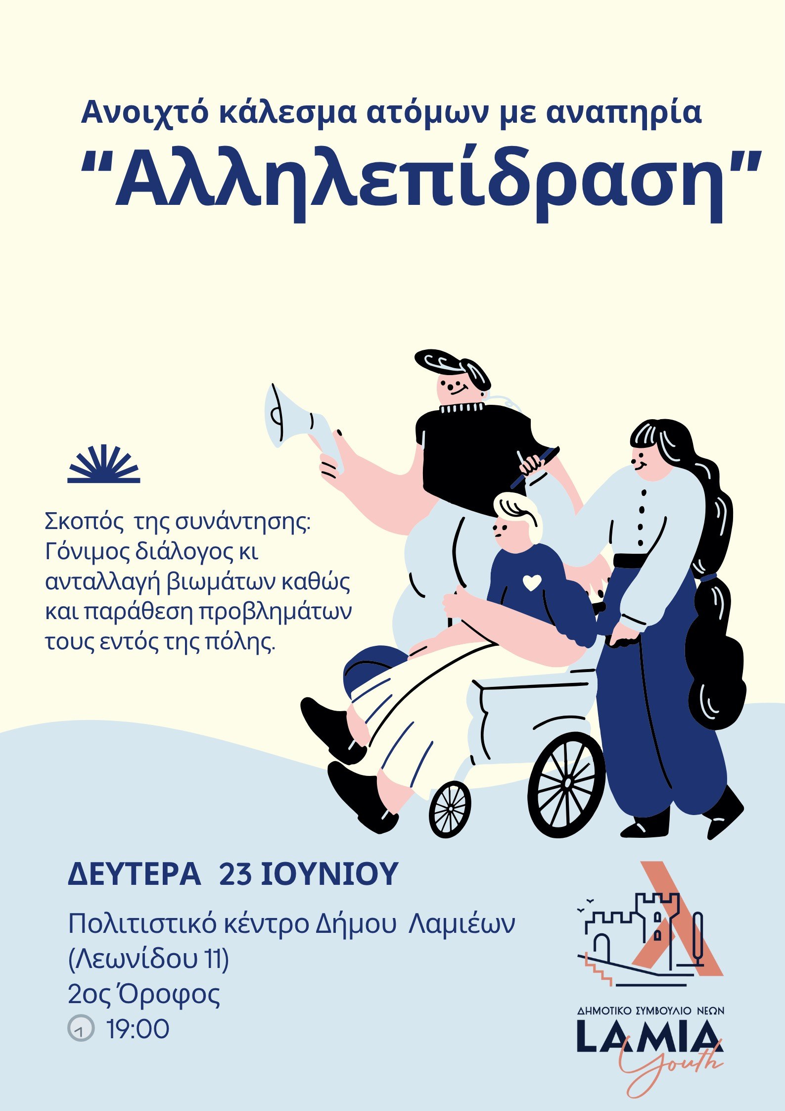 Το Συμβούλιο Νέων του Δήμου Λαμιέων σας προσκαλεί τη Δευτέρα 23 Ιουνίου και ώρα 19:00 στο Πολιτιστικό Κέντρο του Δήμου Λαμιέων (Λεωνίδου 11, 2ος όροφος) στην εκδήλωση «Αλληλεπίδραση με ΑμεΑ».