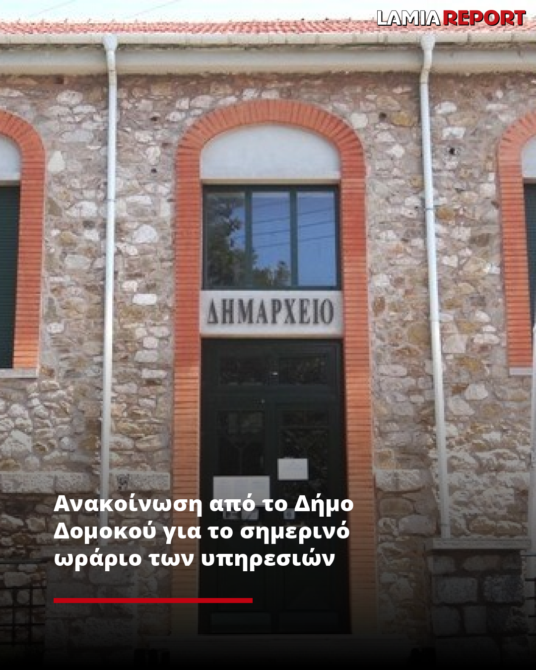 Ο Δήμος Δομοκού ενημερώνει τους πολίτες ότι σήμερα, Πέμπτη 5 Φεβρουαρίου, οι υπηρεσίες του Δήμου Δομοκού, καθώς και όλες οι αποκεντρωμένες υπηρεσίες του, θα λειτουργήσουν έως τις 12:30 μ.μ.