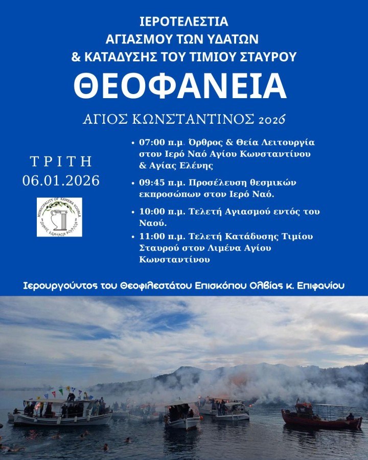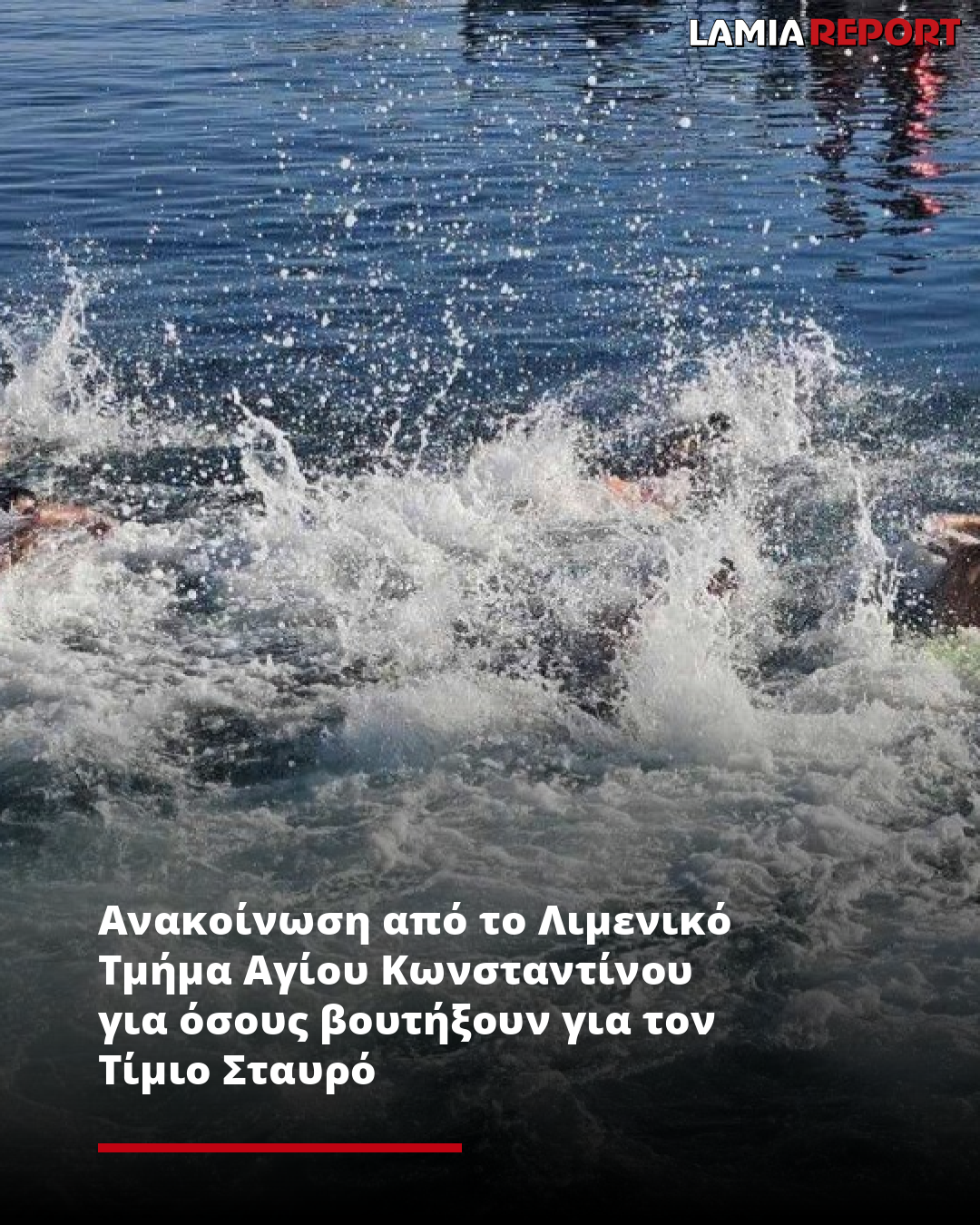 Το Β’ Λιμενικό Τμήμα Αγίου Κωνσταντίνου του Λιμεναρχείου Στυλίδας ενημερώνει τους επιθυμούντες να καταδυθούν κατά την καθιερωμένη τελετή καθαγιασμού των υδάτων , για την ανεύρεση του Τιμίου Σταυρού, που θα πραγματοποιηθεί στο λιμάνι του Αγίου Κωνσταντίνου την 06-01-2026 και ώρα 11:00 στο πλαίσιο του εορτασμού των Θεοφανίων , ότι θα πρέπει να δηλωθεί η συμμέτοχή τους και να προσκομισθούν τα απαραίτητα δικαιολογητικά στο Β’ Λ/Τ Αγίου Κωνσταντίνου (τηλ.2235031759) το αργότερο μέχρι την 10:00 ώρα της 06 Ιανουαρίου 2026.