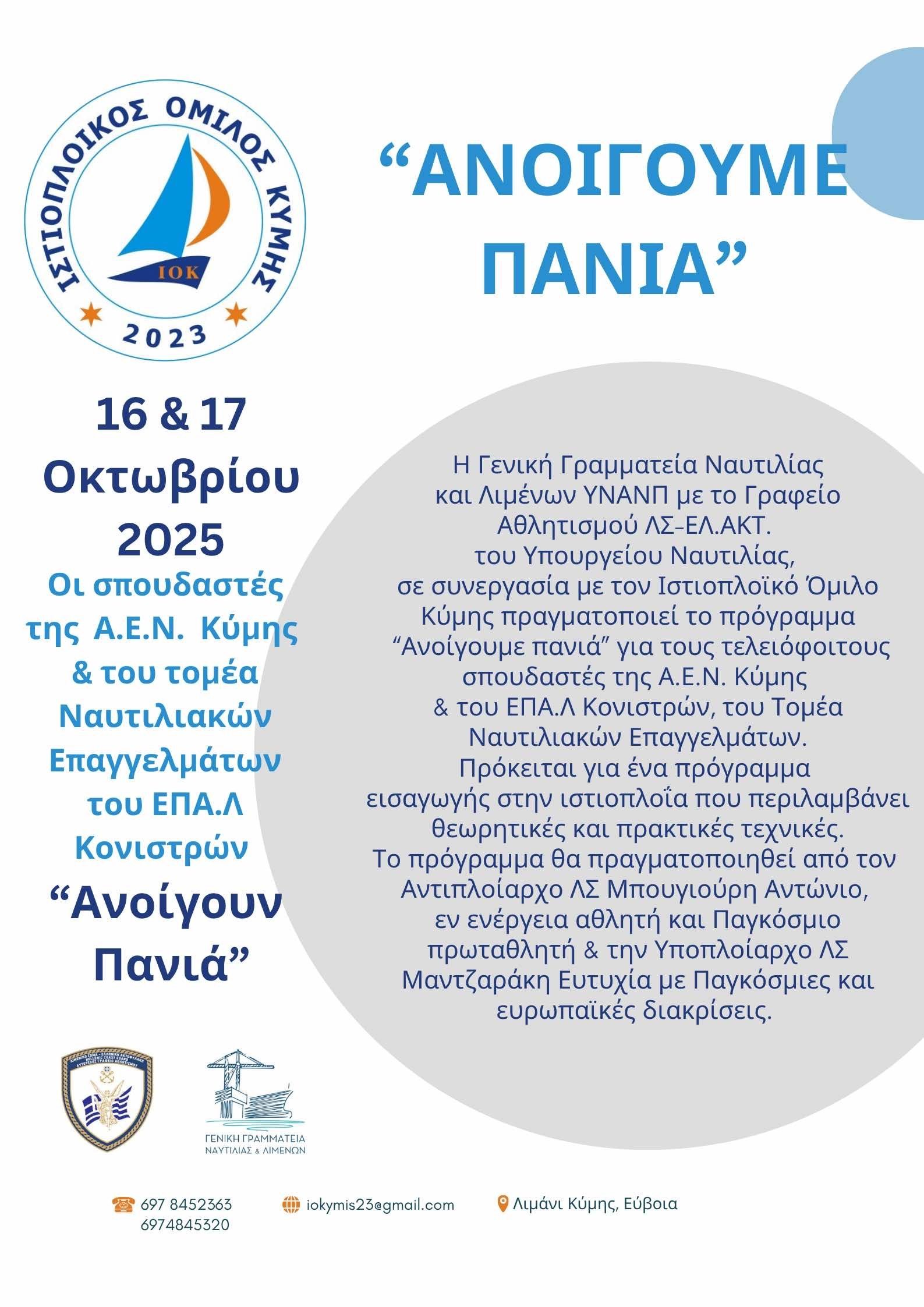 Τη διήμερη εκπαιδευτική δράση με τίτλο «Ανοίγουμε Πανιά» πραγματοποίησε το Γραφείο Αθλητισμού του Λιμενικού Σώματος - Ελληνικής Ακτοφυλακής (Λ.Σ.-ΕΛ.ΑΚΤ.) στην Κύμη, στις 16 και 17 Οκτωβρίου 2025, παρουσία του Γενικού Γραμματέα Ναυτιλίας και Λιμένων (Γ.Γ.Ν.Λ.) του Υπουργείου Ναυτιλίας και Νησιωτικής Πολιτικής (ΥΝΑΝΠ), κ. Ευάγγελου Κυριαζόπουλου.