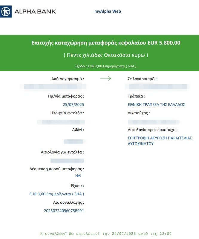 11 Ιουλίου του ζήτησαν και τα υπόλοιπα χρήματα ώστε να κόψουν τιμολόγιο και να του φέρουν την επόμενη μέρα το αυτοκίνητο στο σπίτι. Πράγματι του έστειλαν τα παραστατικά και τους έστειλε ακόμη 3800 €.