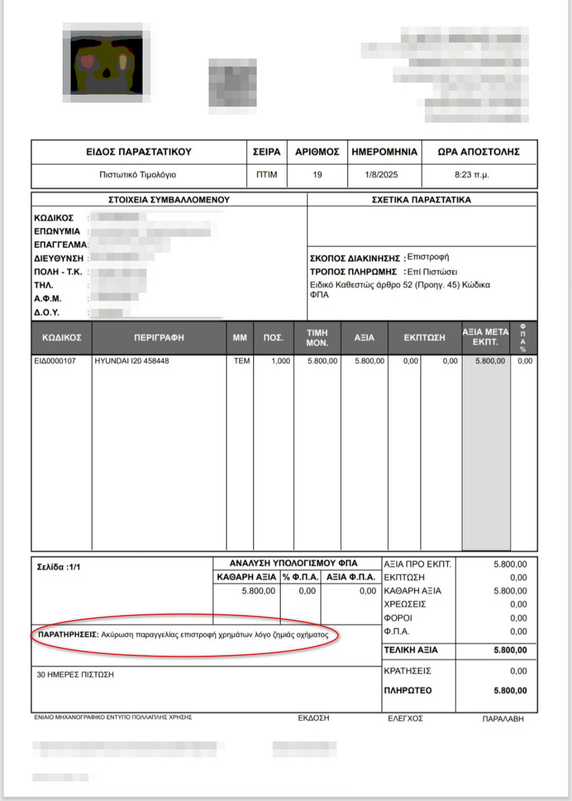 (Το Πιστωτικό Τιμολόγιο για την επιστροφή των χρημάτων)