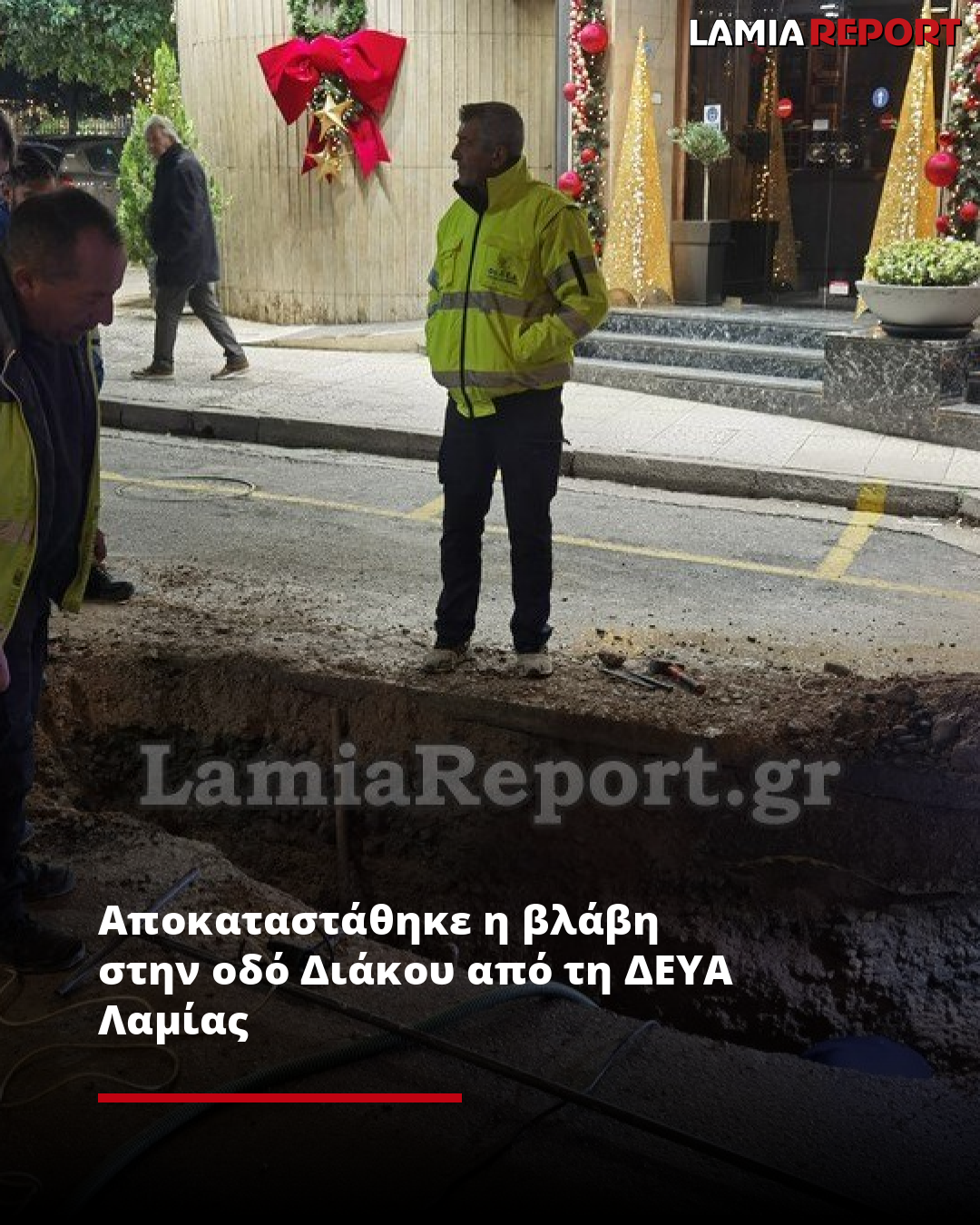 Την ώρα που όλη η Λαμία διασκέδαζε με τη συναυλία του Θοδωρή Φέρρη στην εκδήλωση ανάμματος του Χριστουγεννιάτικου δέντρου που διοργάνωσε ο Δήμος, υπήρχαν άνθρωποι που δούλευαν πυρετωδώς για να αποκαταστήσουν μια πολύ σημαντική βλάβη σε αγωγό ύδρευσης, που είχε ως συνέπεια και τη διακοπή της κυκλοφορίας στην οδό Διάκου.